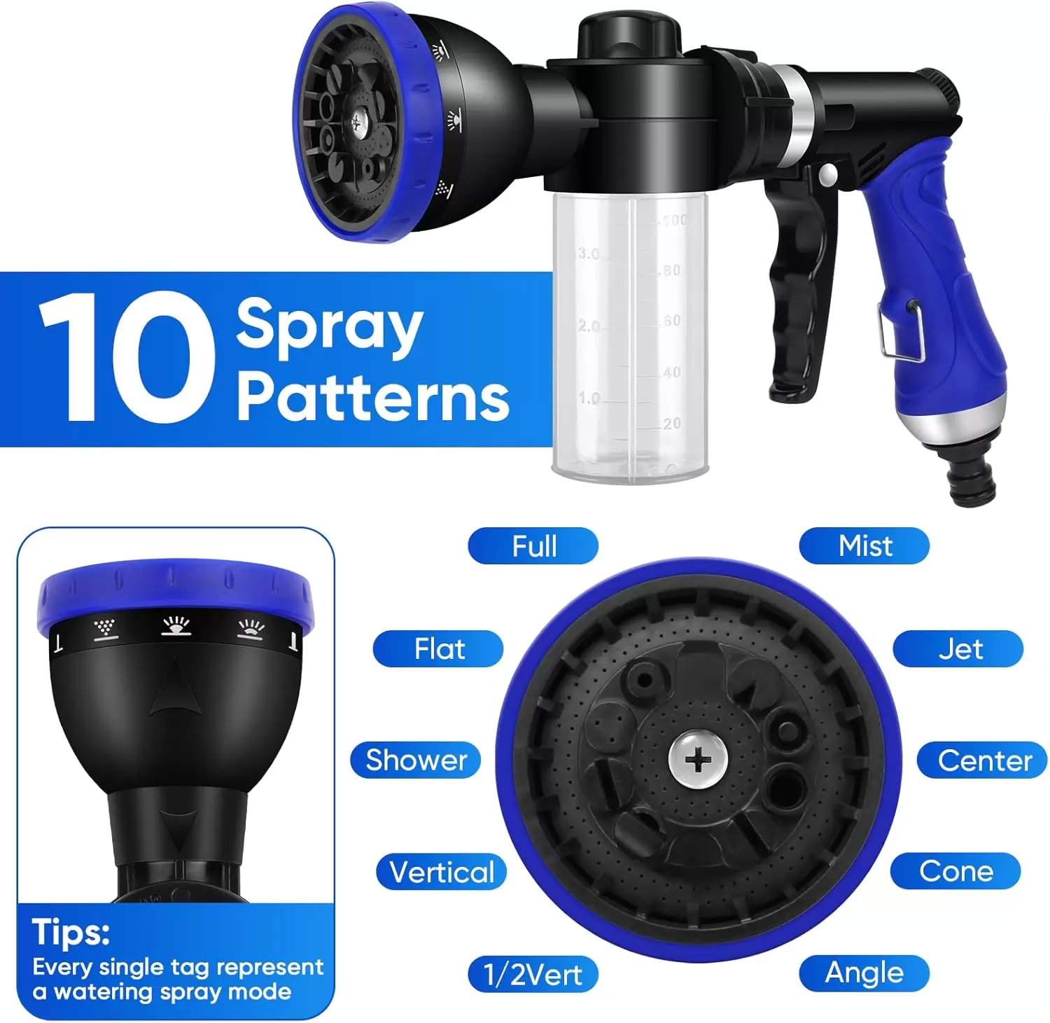 10 patrones de riego: gira el dial del cabezal rociador para seleccionar un patrón de agua como quieras, plano, lleno, niebla, chorro, centro, cono, ángulo, vertical, ½ vertical y así sucesivamente. El rociador de riego de baja presión funcionará correctamente, ampliamente utilizado en exteriores. Los 10 patrones de riego no solo se pueden utilizar en la limpieza de jardines y automóviles, sino que también se pueden utilizar en la limpieza de ventanas, si la ventana de tu casa tiene algo de polvo, entonces puedes utilizar nuestro producto para limpiarlo, también es una herramienta útil de limpieza del hogar.