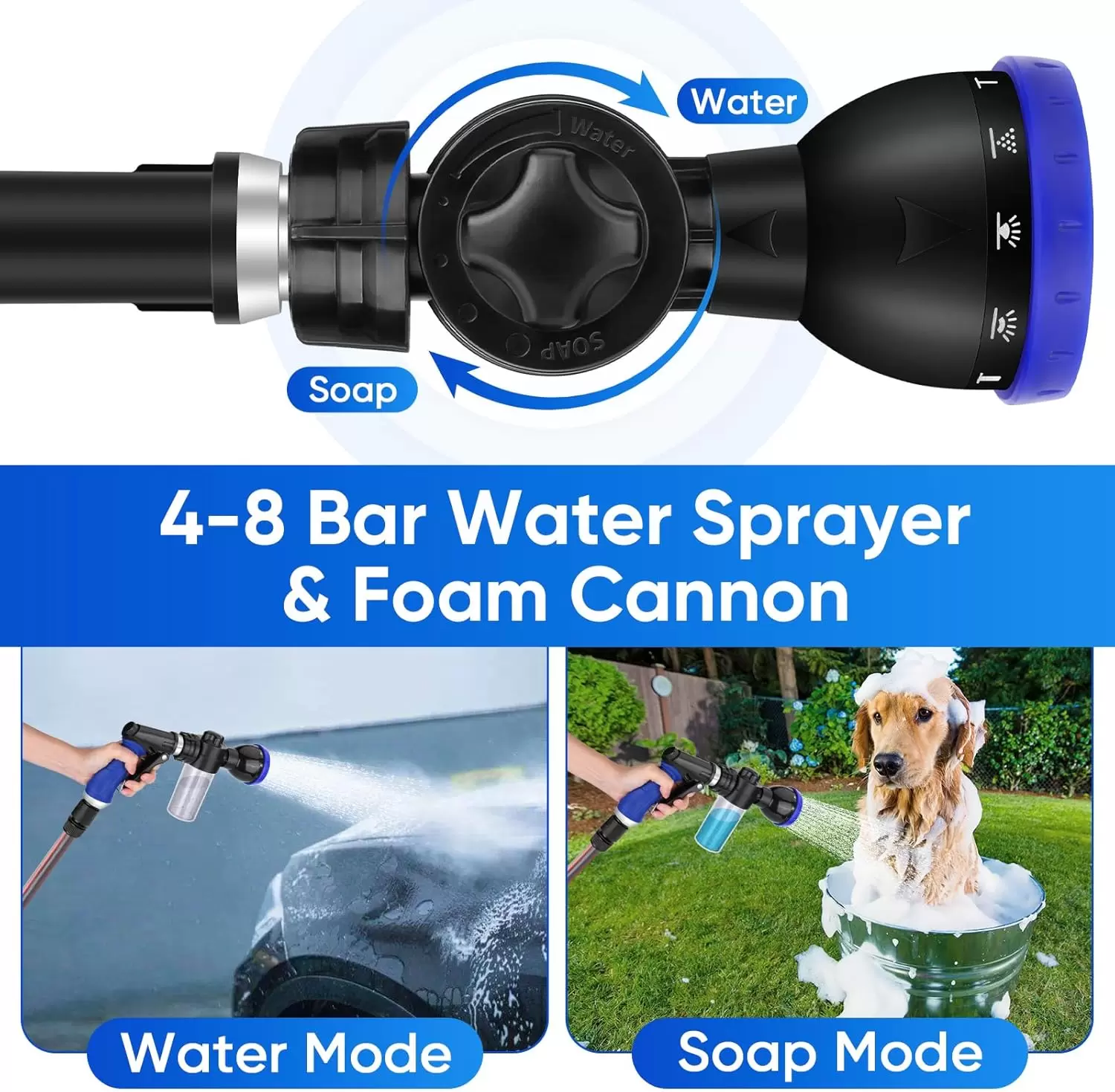 Pistola de agua para perros con 10 modos y dispensador de espuma. La solución perfecta para un lavado eficiente y cómodo, dejando a tu mascota limpia y feliz.