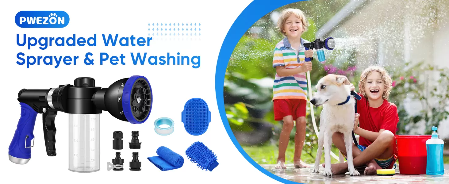 Kit de limpieza 16 en 1: este es el mejor juego de herramientas de limpieza para mascotas para cualquier amante de los perros y los automóviles, tiene herramientas útiles, incluye boquilla de espuma, controlador de dial de ajuste, guante de lavado, botella de 3.5 fl oz, toalla, conector, boquilla de pulverización, acoplamiento rápido, conector de manguera, 3 grifos, cubierta de goma incluso.