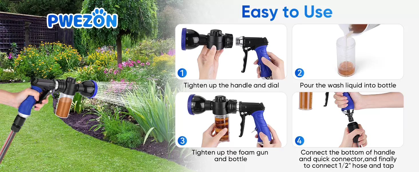 Pulverizador de baño para perros: la presión de 4 a 8 bares es perfecta y adecuada para el baño de perros, limpieza de automóviles y uso de riego de jardín, hay una función 2 en 1 para resolver tus necesidades, mientras que puedes usarlo como una lavadora de espuma y luego usarlo como un rociador de riego para lavar al perro, ahorrará tiempo de alguna manera. Este producto tiene un dial de ajuste integrado que diseña para escala 5 para rociar diferentes espesores de espuma. Duradero y práctico para su uso. No hay fugas. 3.4 fl oz de cuerpo de HDPE pueden proporcionar un uso duradero.