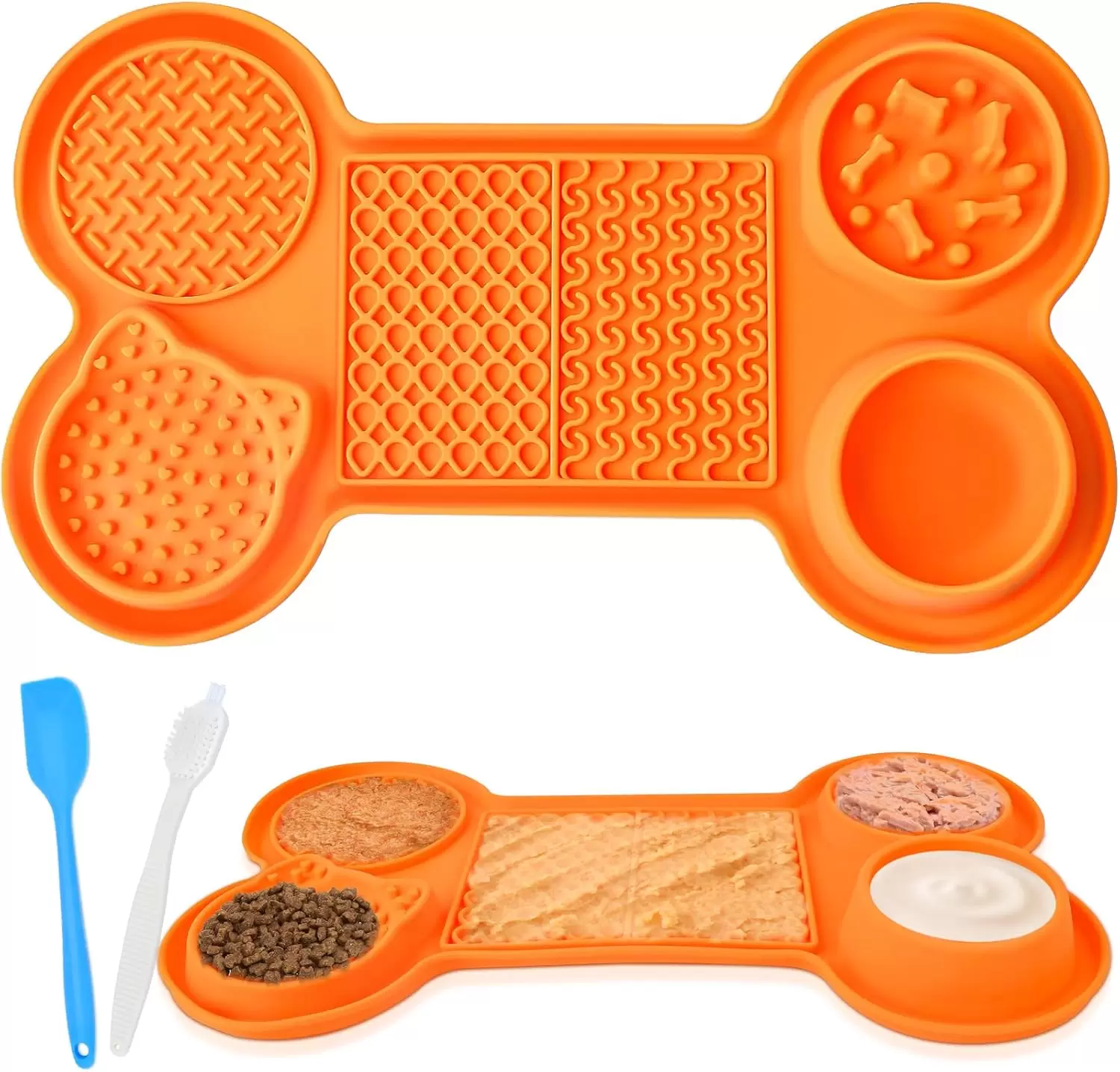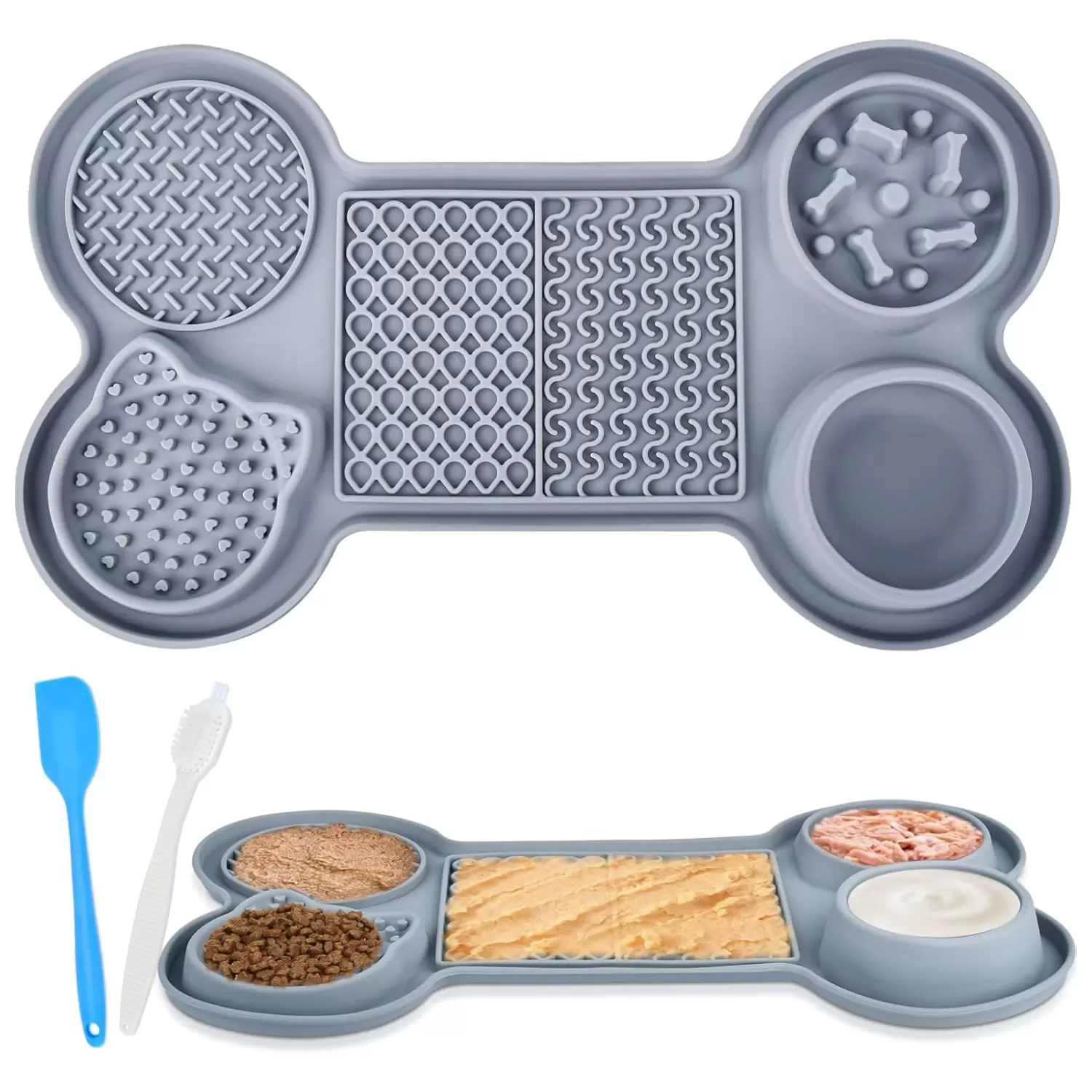 Alimentador 6 en 1 mejorado: nuestro tapete multifuncional de silicona de grado alimenticio adopta un diseño de partición 6 en 1, incluyendo un recipiente de agua para líquidos como agua o leche, dos cuencos de alimentación lenta para alimentos sólidos como comida para perros, aperitivos, etc., y tres áreas de lamer con diferentes patrones para diferentes alimentos líquidos como yogur, mantequilla de maní, etc. Con una de nuestras alfombrillas de alimentación, tu mascota puede experimentar una variedad de diversión y satisfacer todas las necesidades de tu mascota