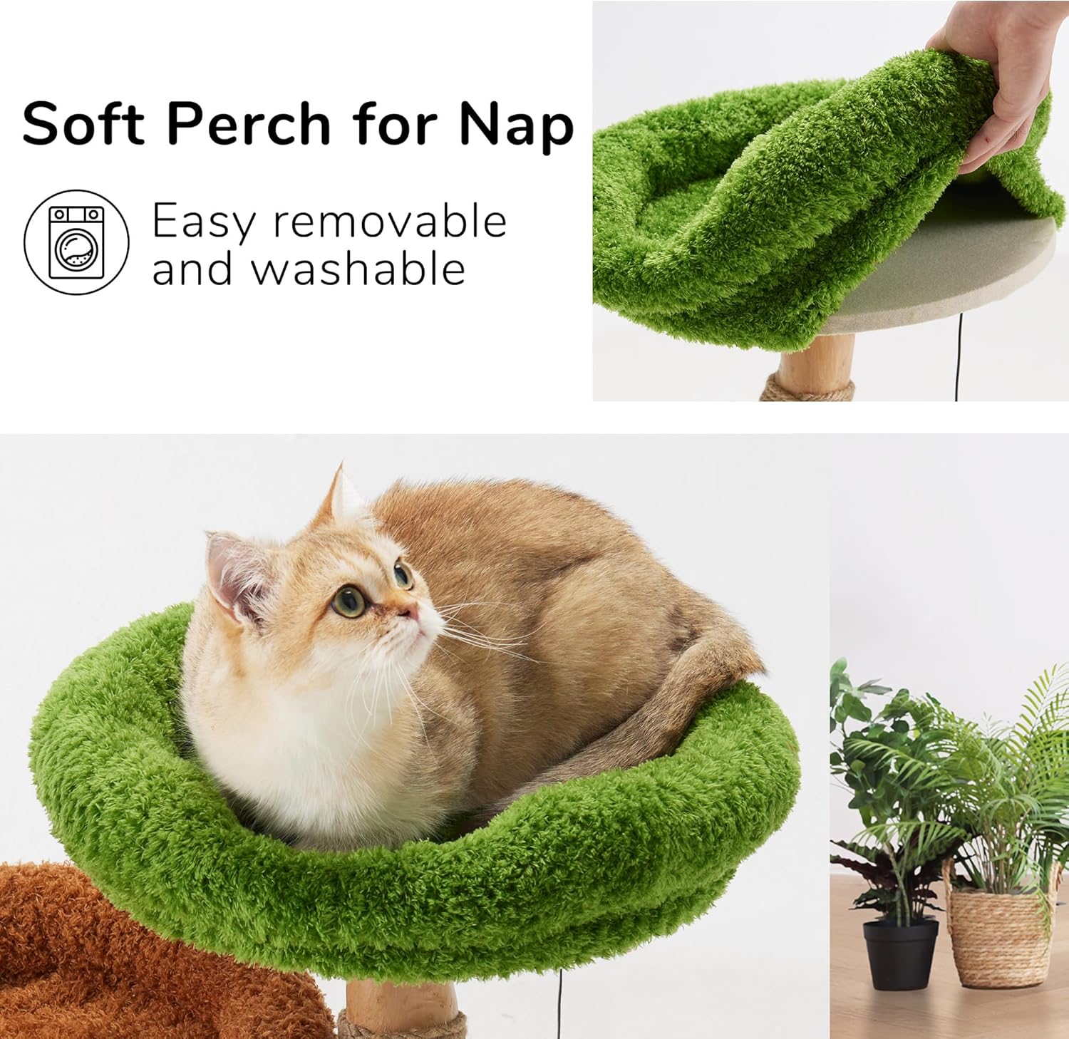 Percha suave para gatos: la cama verde superior está hecha de material de felpa suave, ofrece un lugar cálido y cómodo para dormir para los gatos mientras proporciona una vista elevada para que los gatos puedan observar su entorno. La funda de cama es lavable a máquina, fácil de quitar y reutilizable.