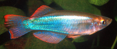 Killy Africano de tonos azules, pero de duracion, llega a vivir hasta 4 años en los acuarios como cualquier pez de su tamaño, tranquilo y de un tamaño entre 4 y 5 centimetros, las hembras algo mas pequeñas.