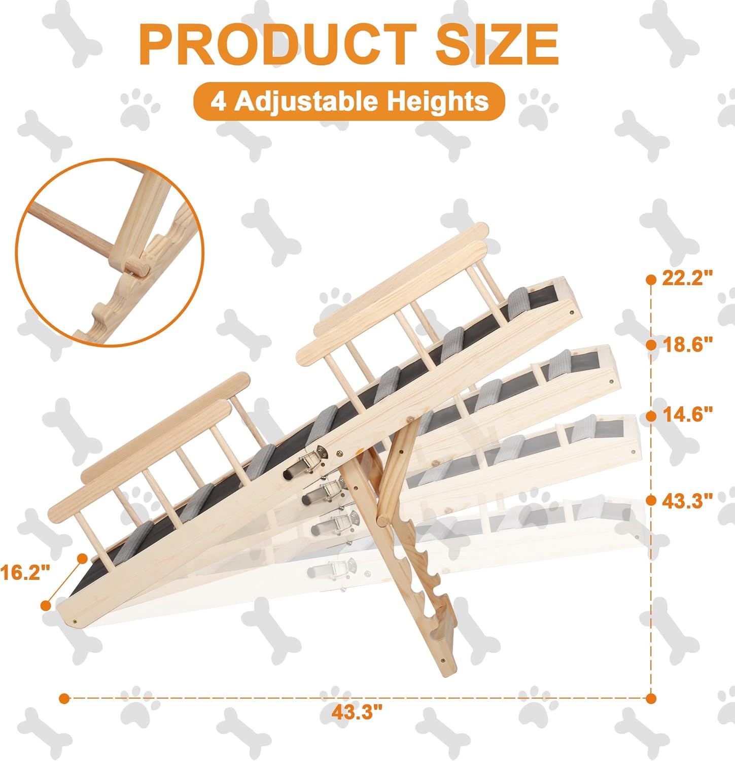 Altura ajustable: esta rampa para perros tiene 4 alturas ajustables, 10.9, 14.6, 18.6 y 22.2 pulgadas. Se adapta a la mayoría de los muebles y automóviles de tu hogar. El tamaño después del plegado es de 21.6 pulgadas de largo, 16.2 pulgadas de ancho, 5.5 pulgadas de alto sin pasamanos. Cuando se abre, el ancho de la rampa para mascotas es de 16.2 pulgadas, longitud 43.3 pulgadas, altura 8.6 pulgadas con pasamanos. Puedes colocar fácilmente la rampa para mascotas en tu automóvil o debajo de sofás y camas sin ocupar mucho espacio