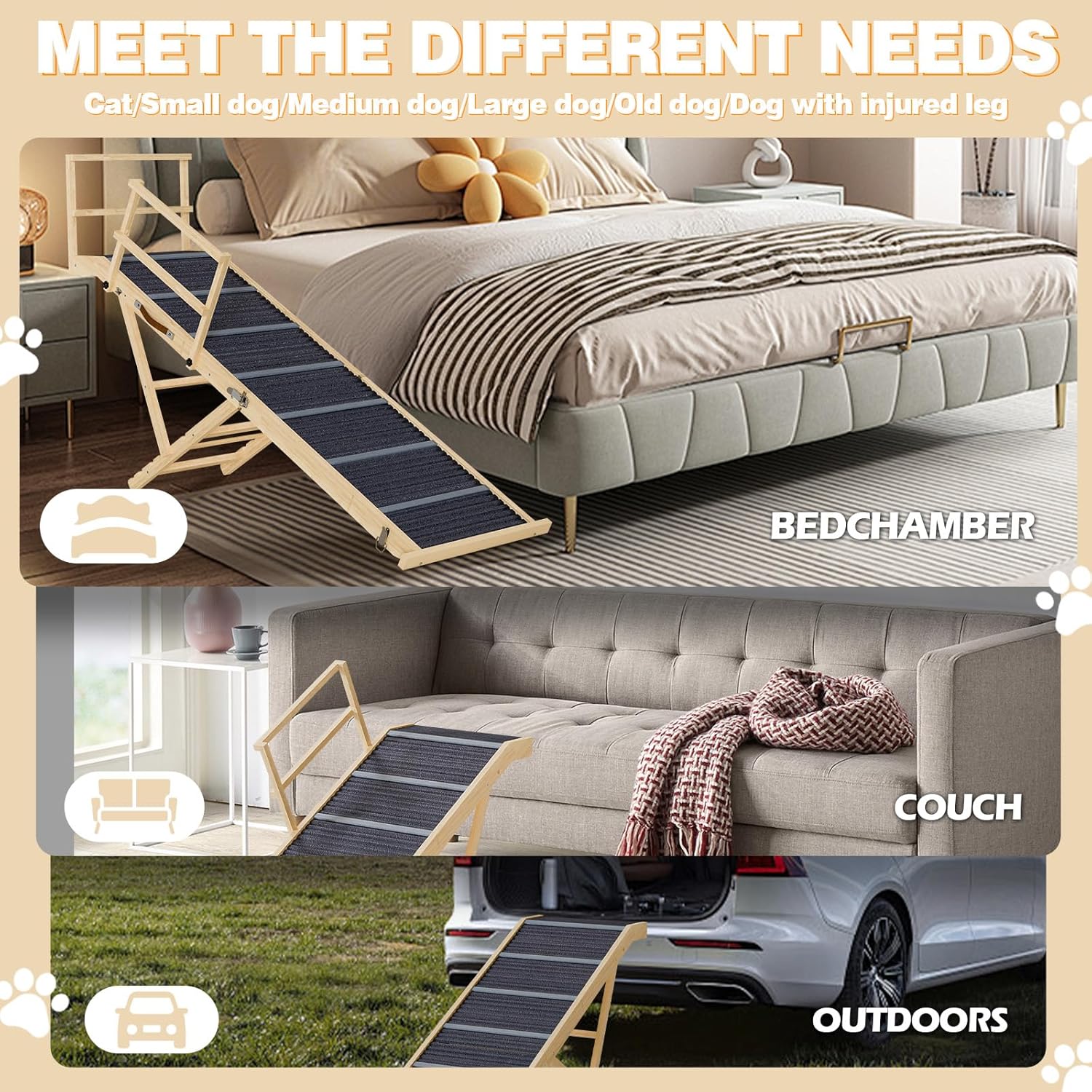 Altura ajustable estable y riel de seguridad: nuestra rampa plegable de madera para perros se ajusta de 24.6″ a 29″ para ayudar a su mascota a llegar a cualquier lugar fácilmente. Seis alturas ajustables proporcionan una pendiente gradual que no es demasiado empinada, y el riel de seguridad desmontable reversible evita que tus mascotas se resbalen. Este diseño aumenta la confianza de tu perro utilizando la rampa para perros. (Por favor, añade una barrera en la parte superior para evitar que se vuelque)