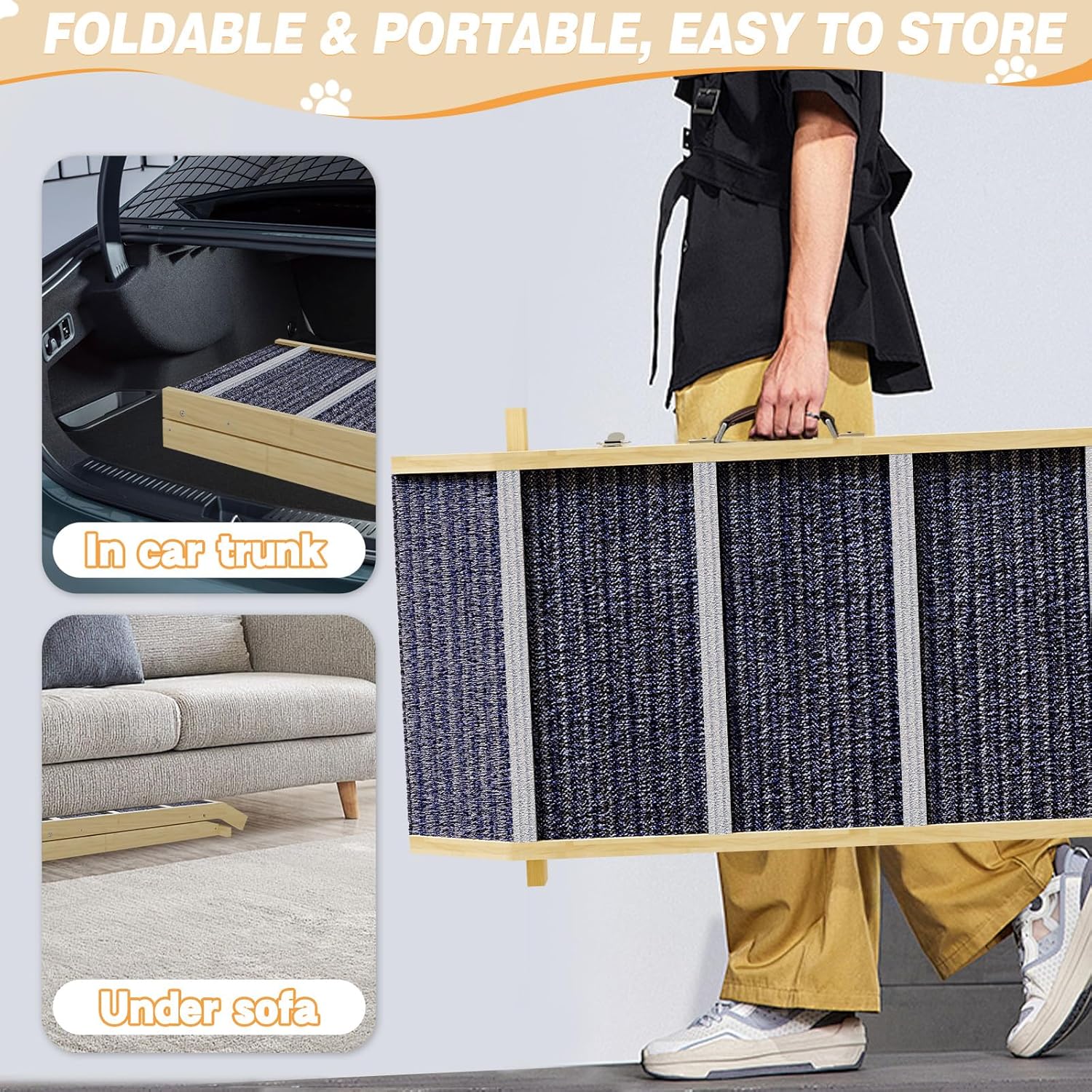 Plegable y portátil: nuestra rampa para perros para cama mide solo 5.1 pulgadas de alto cuando está plegada, lo que hace que sea fácil de colocar en el maletero, debajo de muebles o en un espacio pequeño. Y es fácil de transportar debido al asa especial y al pliegue de la hebilla de seguridad. Esta rampa portátil para mascotas se puede utilizar fácilmente sin montaje.