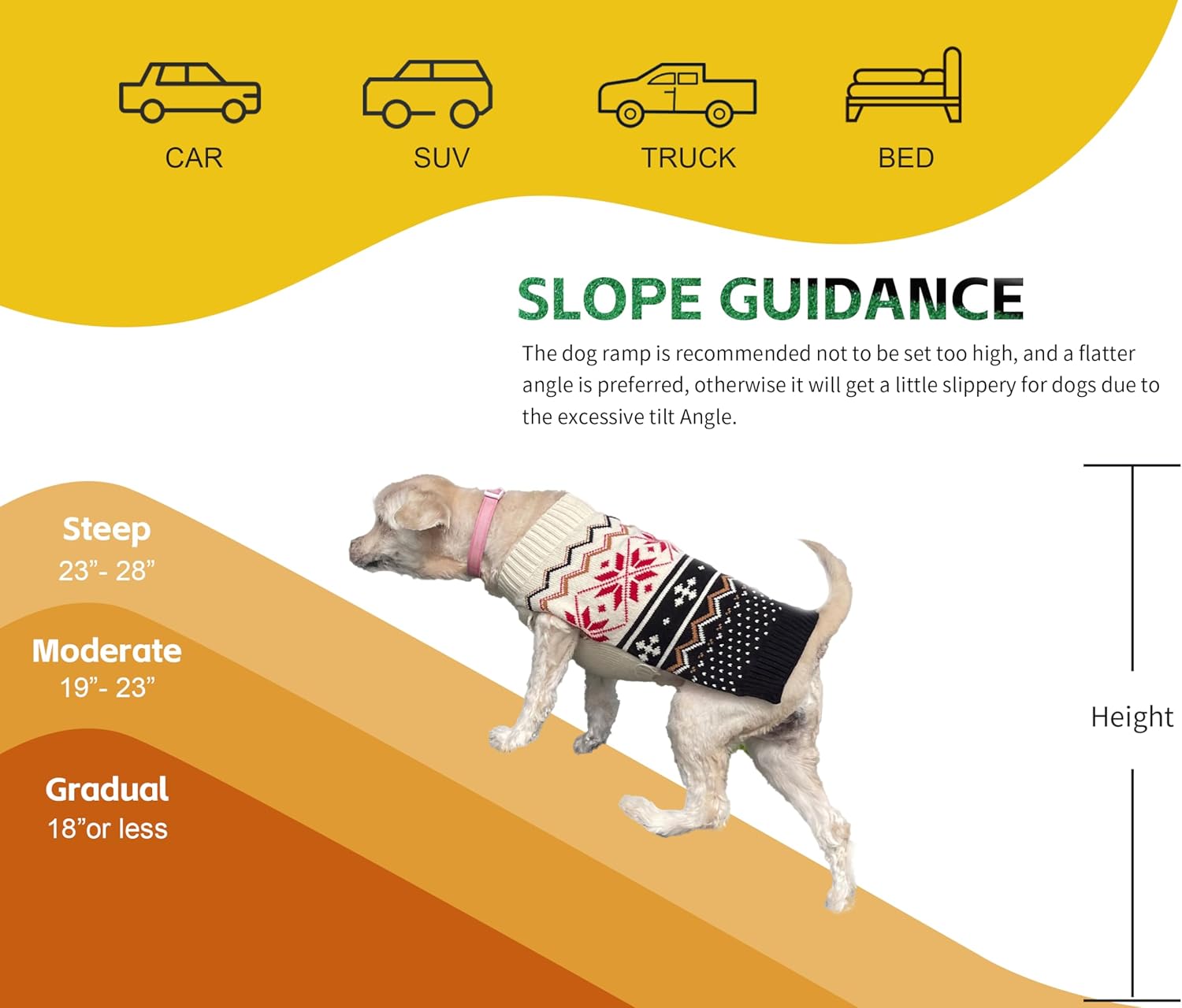 Versatilidad para todas las superficies: desde paseos en automóvil hasta sofás acogedores, nuestra rampa se adapta sin esfuerzo a varias superficies como SUV, automóviles, camiones, maleteros, asientos y camas, asegurando una experiencia de escalada consistente y tranquilizadora para tus mascotas.