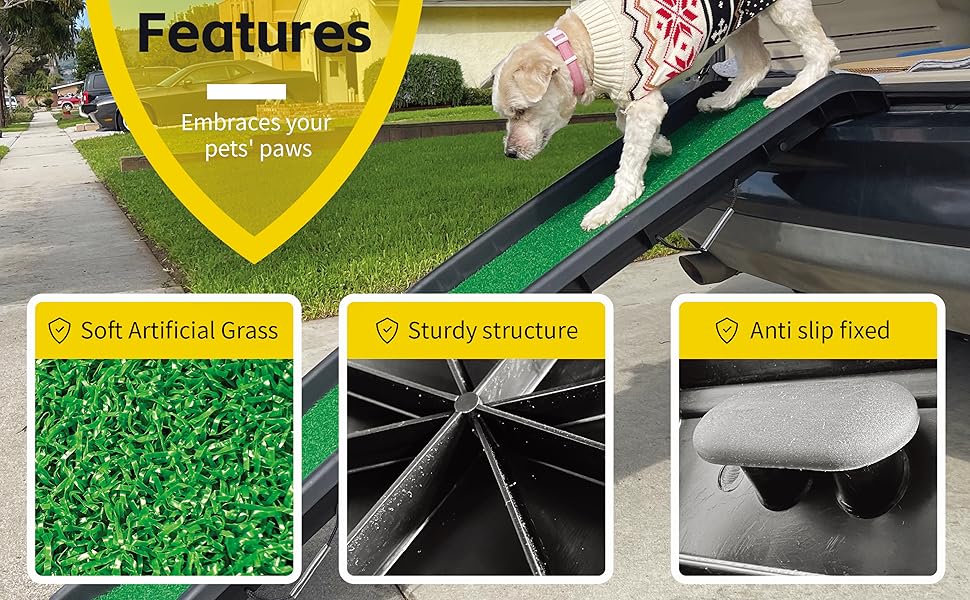 Agarre mejorado de la pata: la superficie de la rampa, adornada con césped artificial suave, abraza las patas de tus mascotas, proporcionando un agarre reconfortante y seguro. Di adiós a los resbalones y hola a las subidas seguras y llenas de alegría.