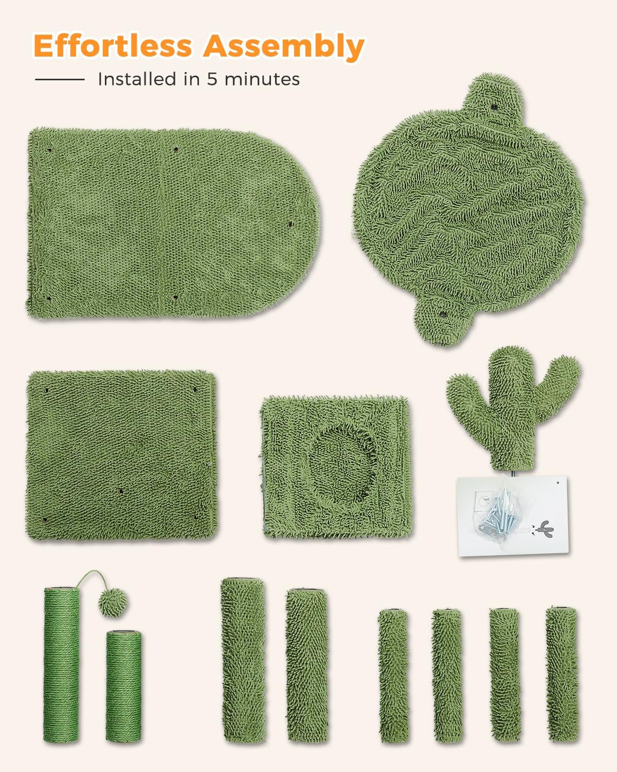 Construcción de calidad: el árbol para gatos MUTTROS Cactus está construido para durar, con materiales resistentes y artesanía experta. Puede acomodar varios gatos y está diseñado para soportar incluso el juego más activo. Fácil de montar: configurar el nuevo parque infantil de tu gato es muy fácil. Las instrucciones claras y las herramientas incluidas hacen que el montaje sea rápido y sin complicaciones.