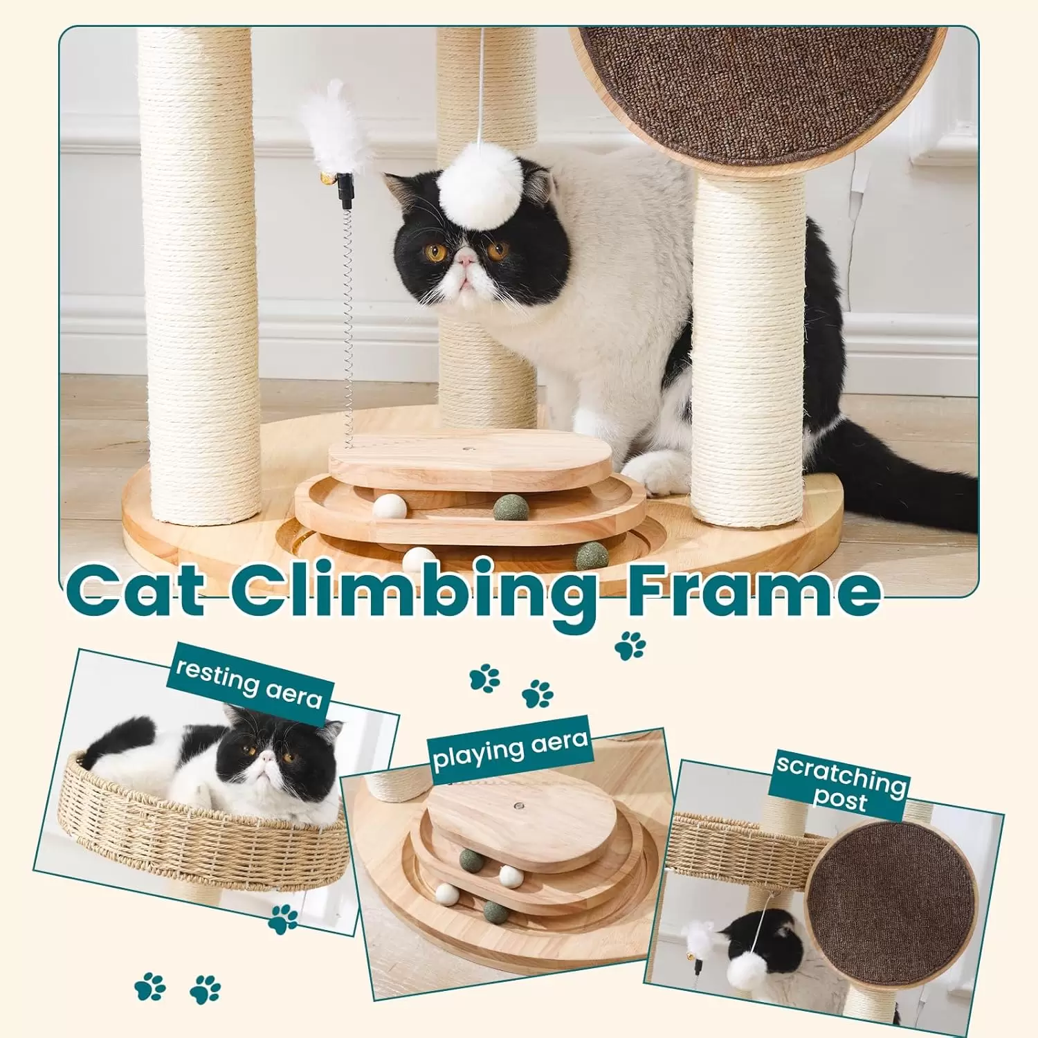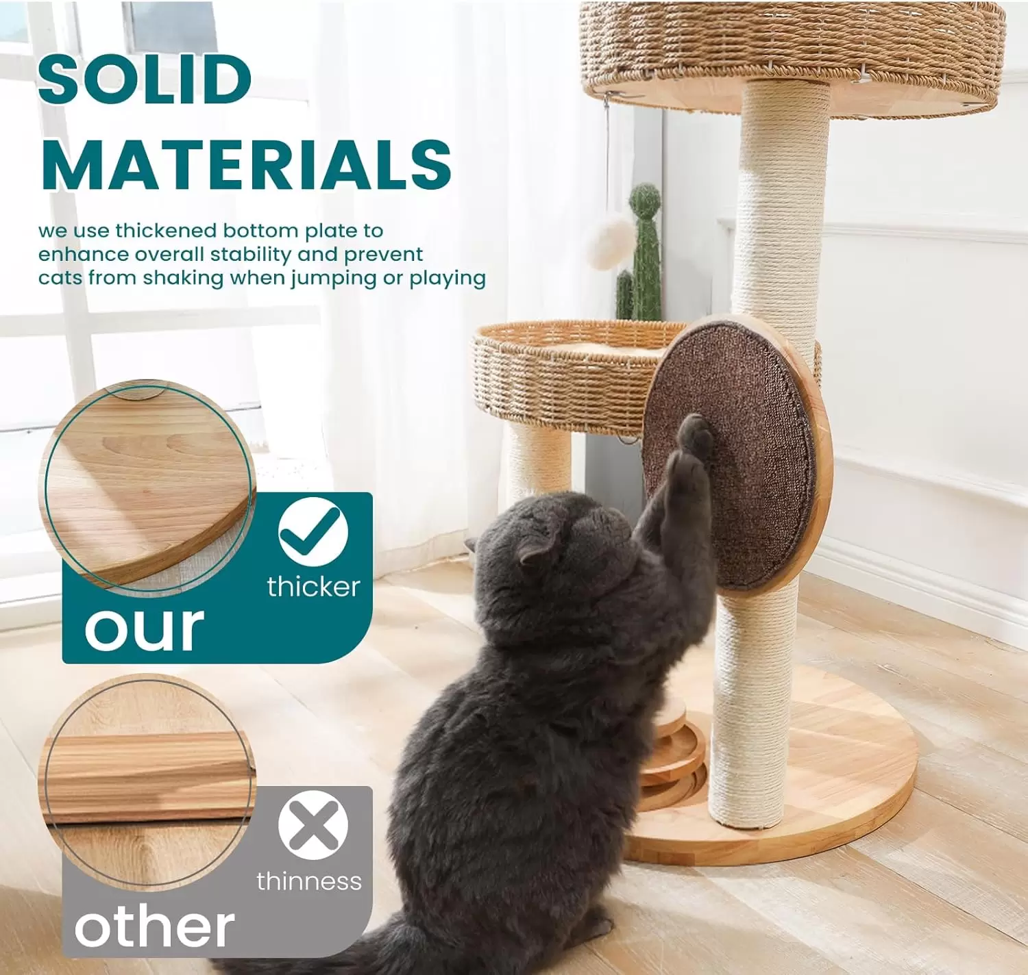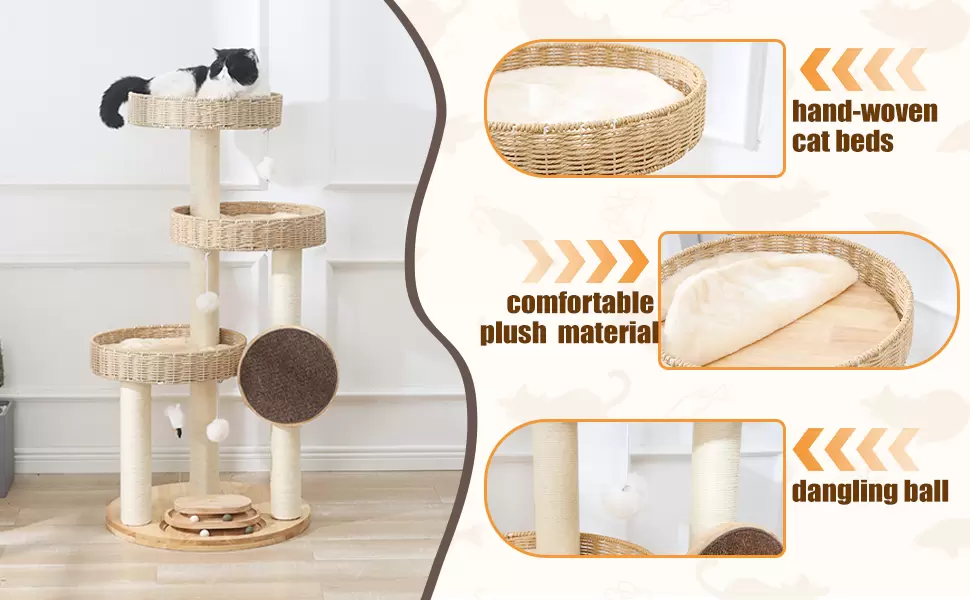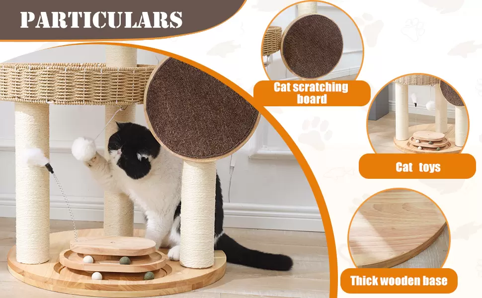 Madera de Roble Genuina: Fabricada con tablas y camas de roble de alta calidad, junto a postes de papel kraft de 3.1 in (aprox. 8 cm) y sisal natural.