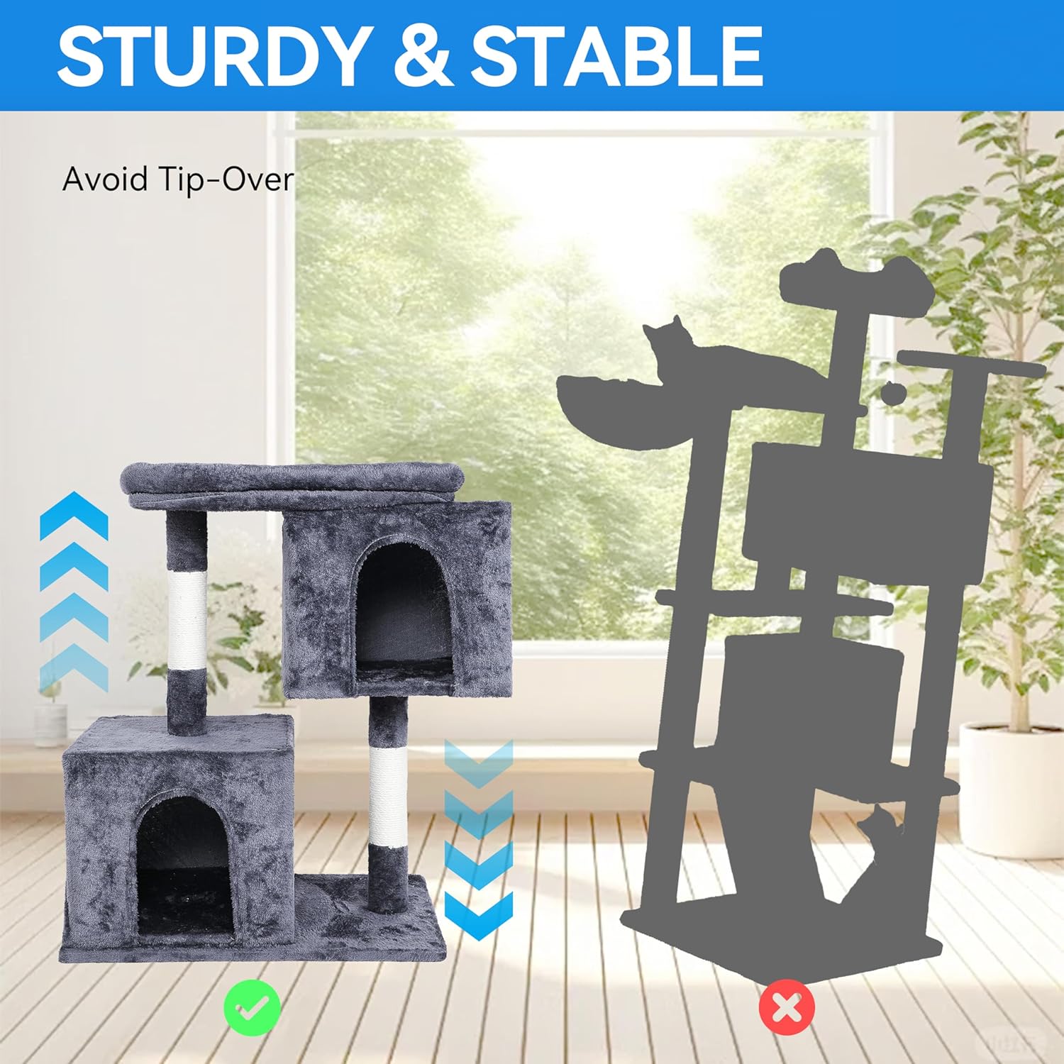Estable y seguro: hecho de materiales de alta calidad sin mal olor. El rascador de sisal grueso y fuerte y la cubierta de tela resistente al desgarro están configurados para un uso prolongado.