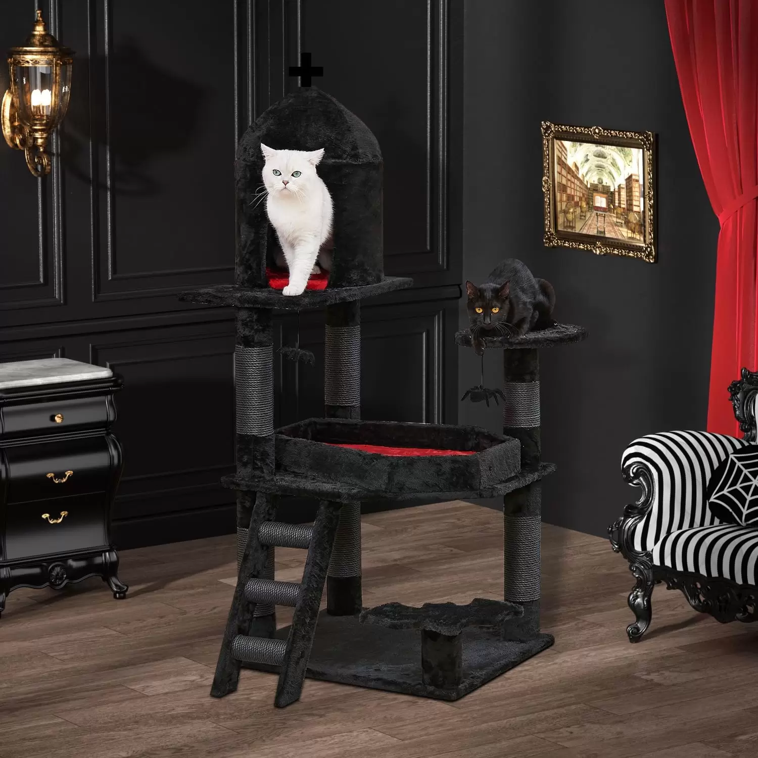 Este mueble para gatos combina un diseño oscuro y elegante con la máxima seguridad, siendo un centro de actividades funcional durante todo el año y una decoración única para Halloween.