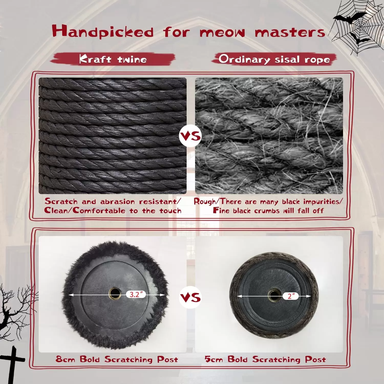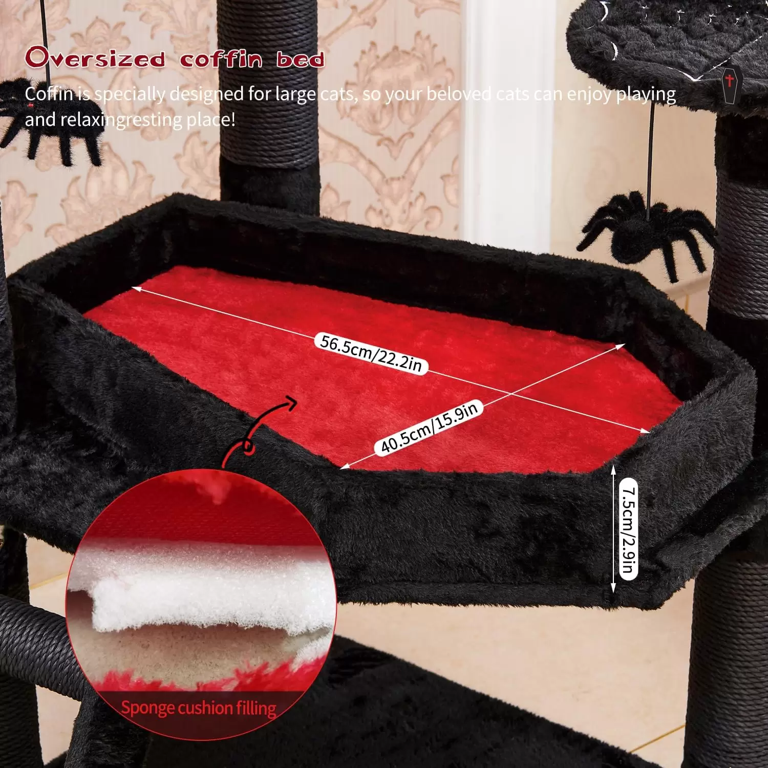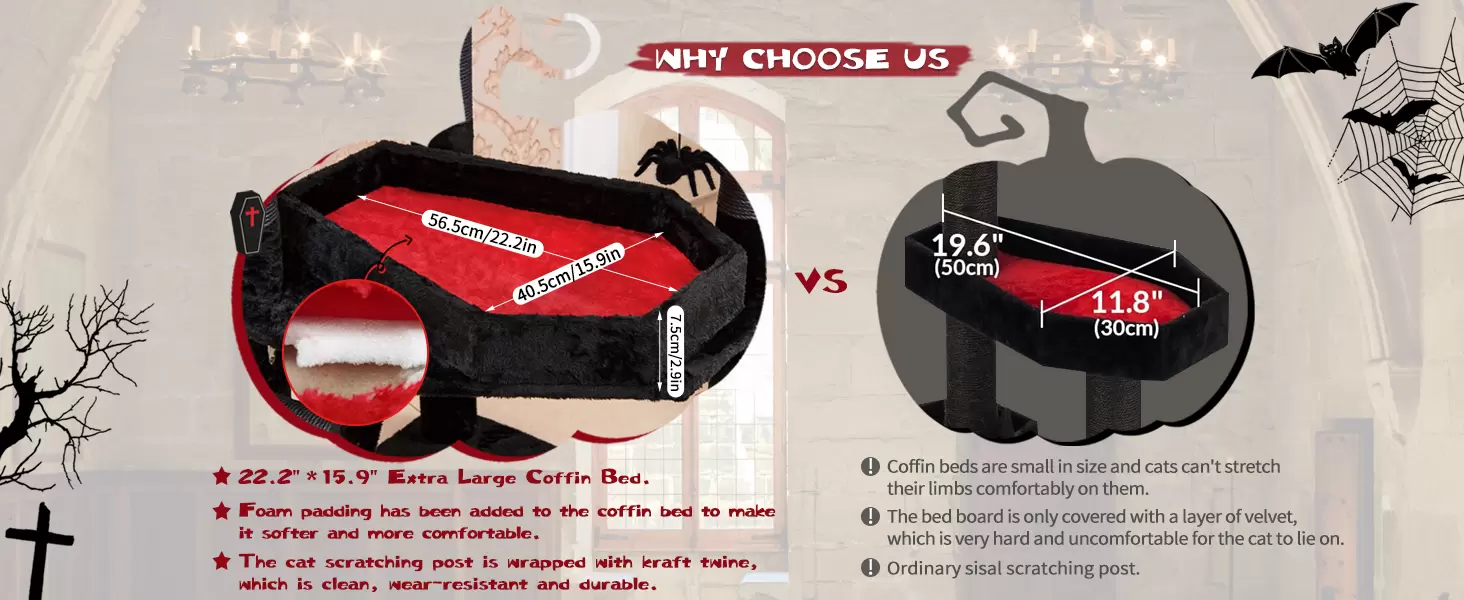 Diseño Gótico Único y Exclusivo: Utiliza felpa negra y roja con detalles temáticos, y postes rascadores cubiertos con cordel kraft negro, creando un estilo gótico inconfundible. Cama Ataúd XL: El ataúd mide 56 centímetros de largo, diseñado específicamente para que su gato grande descanse y juegue cómodamente. Elementos de Juego Temático: Incluye bandas auxiliares en forma de murciélago, plataforma de tela de araña y juguetes de araña.