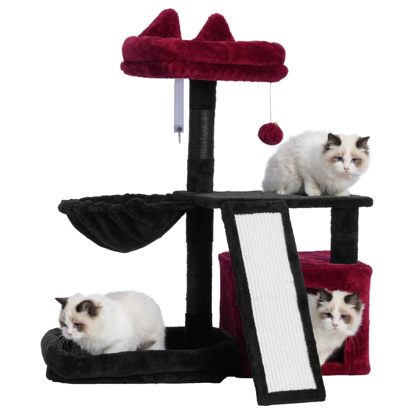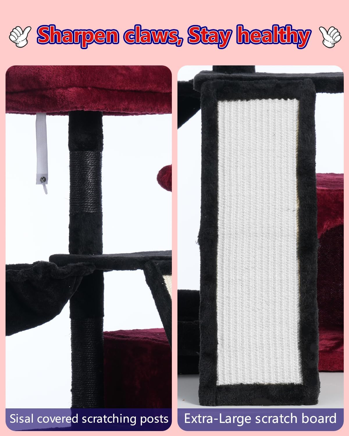 Afilar las garras, mantente saludable: los postes rascadores envueltos en sisal de remolque y una gran tabla para rascar ayudan a mantener tus muebles a salvo de las garras de los gatos