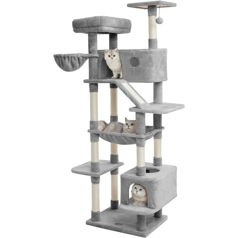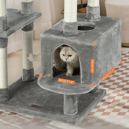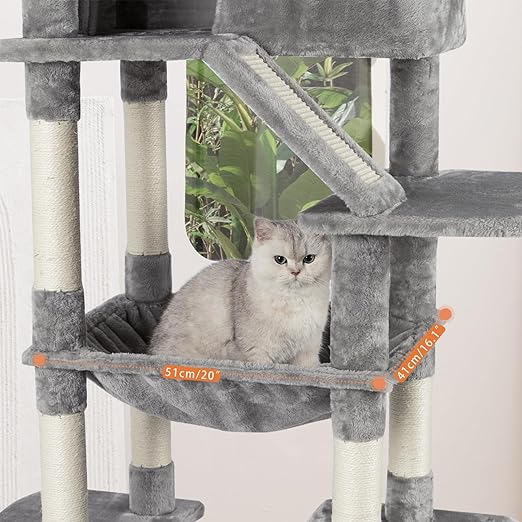 Todo en uno: esta torre alta para gatos cuenta con múltiples niveles, incluyendo postes rascadores y almohadillas de sisal, una percha de felpa acolchada, una canasta acogedora y un condominio de felpa. Ofrece una variedad de actividades y lugares de descanso, manteniendo a sus gatos entretenidos y cómodos. Es una excelente opción para hogares con varios gatos, lo que permite que cada gato tenga su propio espacio.