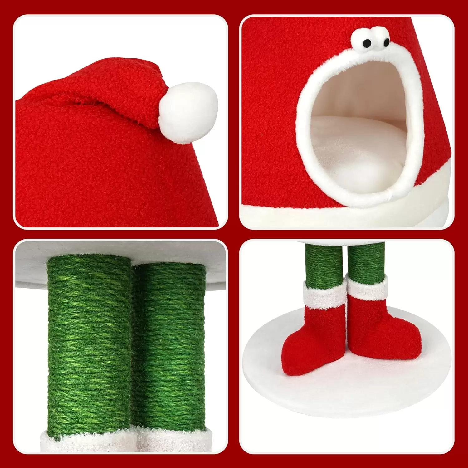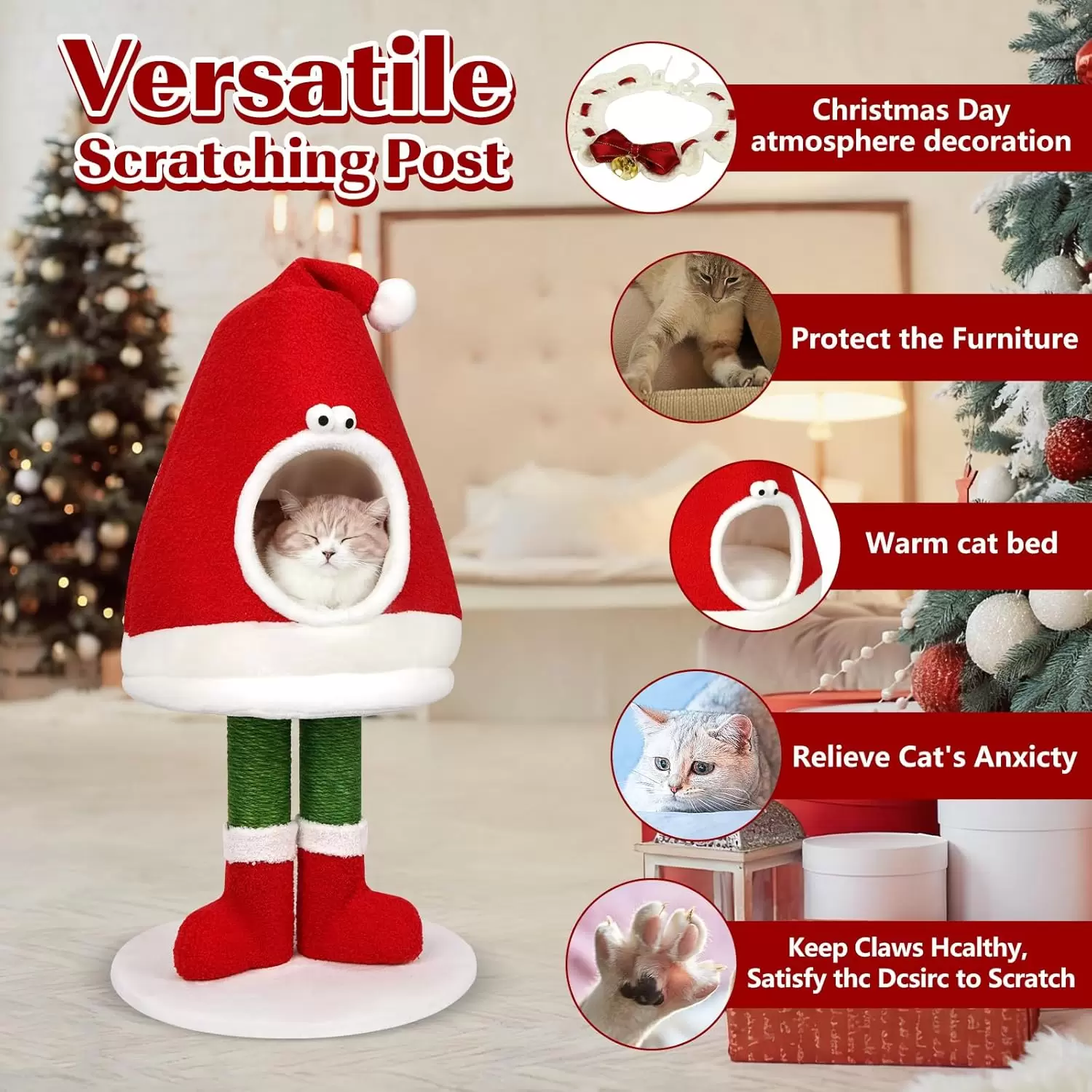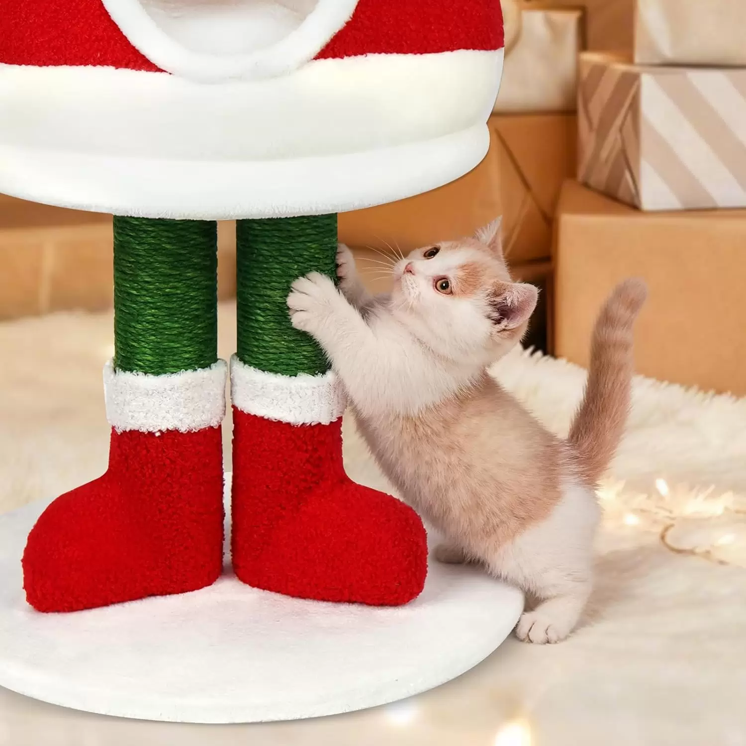 Rascador y Cama 2 en 1 (75x40x32 cm) con sisal natural y diseño Navideño. La cama superior de felpa es cálida y el poste protege tus muebles.
