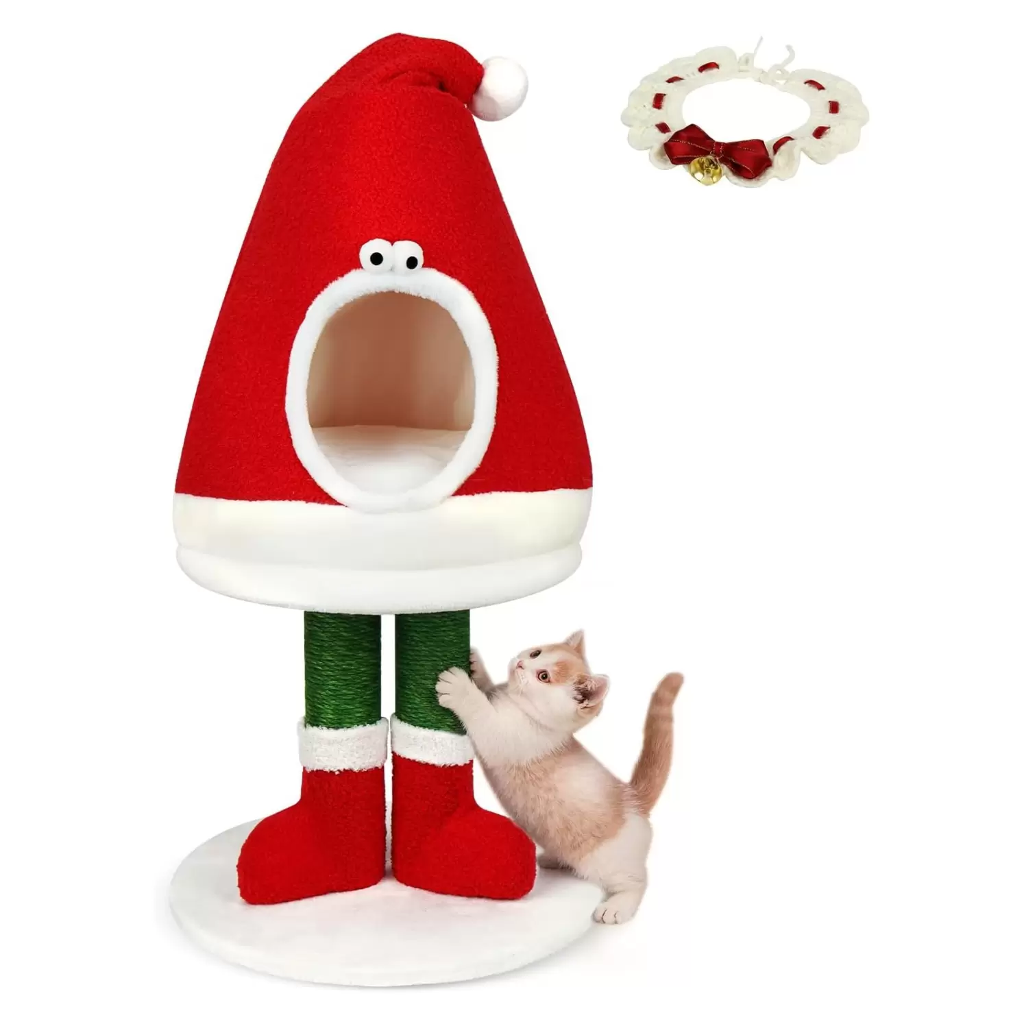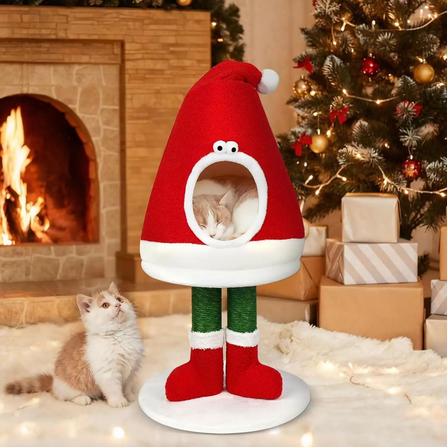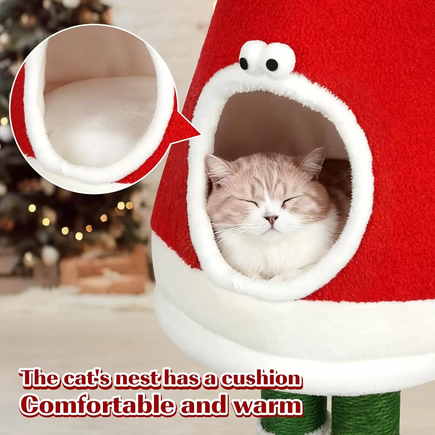 Rascador y Cama 2 en 1 (75x40x32 cm) con sisal natural y diseño Navideño. La cama superior de felpa es cálida y el poste protege tus muebles.