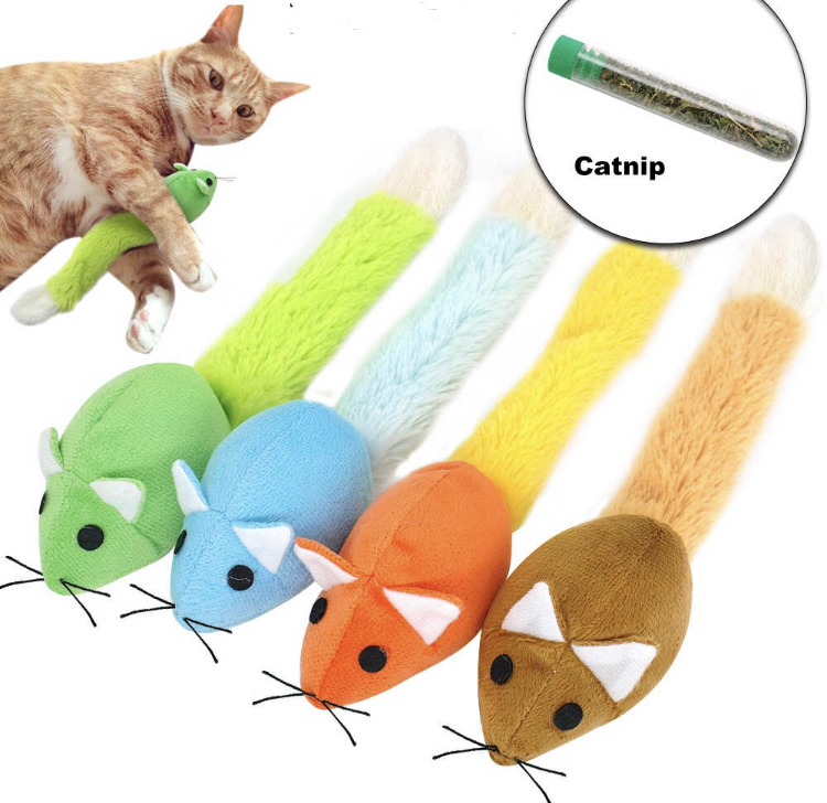 Juguete ratón que viene con catnip, con medidas de : cuerpo 10 cm de largo x 5 cm de ancho y su cola mide 16 cm de largo viene en 4 colores verde , naranja ,azul , café.