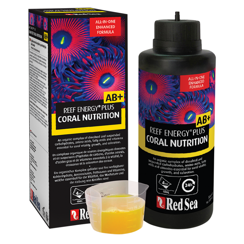 Nutrición de corales. Reef Energy es una fórmula nutritiva completa de 2 partes que proporciona toda la energía, aminoácidos y vitaminas que los corales utilizan para su crecimiento y coloración. Reef Energy A es una formulación única de carbohidratos, aminoácidos y ácidos grasos y bancos de proteínas suspendidas que están disponibles para el consumo directo y absorción de los corales. La suspensión de bancos de proteínas promueve la fauna microbacteriana que llena de forma natural el tejido de coral y aumentará la producción de mucus. Todos los componentes se usan en los procesos metabólicos de la producción de proteínas del coral y en la regeneración del tejido blando y, por lo tanto, no introduce material orgánico innecesario en el sistema. Reef Energy A estimula la extensión de los pólipos y tejido blando, lo que ayuda al coral a optimizar el consumo de nutrientes expandiendo el área de superficie de absorción. Reef Energy B es un complejo altamente concentrado de vitaminas y aminoácidos, conocidos por ser los factores limitadores en las demandas nutricionales de los corales y otros invertebrados. Este complejo regenera las vitaminas y MAA (aminoácidos marinos) exactos producidos por las Zooxanthellae. Las vitaminas son importantes precursores en la síntesis de cromoproteínas mientras que los aminoácidos suponen la base. Todos los componentes de Reef Energy B provienen de fuentes marinas y se emulsifican en un medio único que mejora su solubilidad y la absorción de las vitaminas y ácidos de los corales. La cantidad de nutrientes de coral necesaria dependerá del tipo de coral almacenado. Los requisitos de nutrientes de los corales SPS en concreto también dependen de los niveles de nutrientes de las algas (nitrato y fosfato) en el agua. En los sistemas de nutrientes de algas reducidos, por ejemplo al usar NO3:PO4-X de Red Sea, la cantidad de energía de los corales recibida de las Zooxanthellae se ve significativamente reducida y, por tanto, se deben suministrar los niveles de nutrientes de coral para satisfacer las demandas energéticas de los corales.