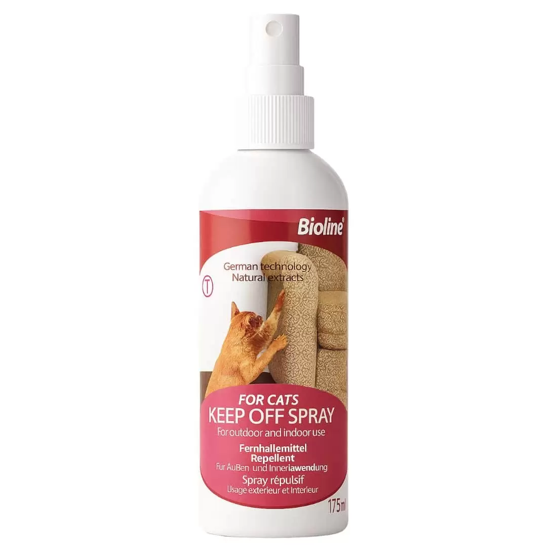 Bioline Keep Off Spray for Cats, un repelente para gatos diseñado para uso en interiores y exteriores.