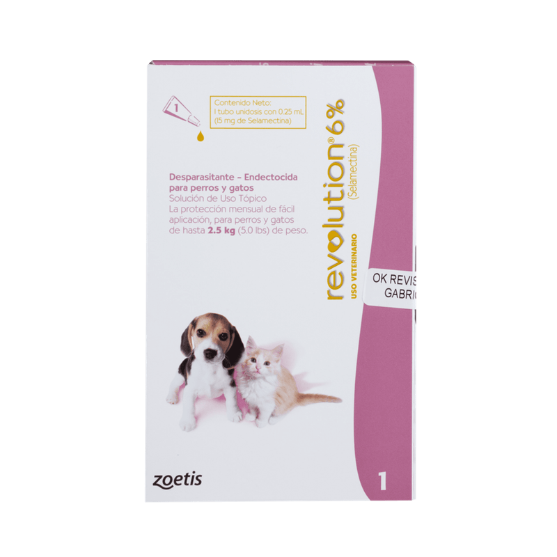 REVOLUTION 6% El ANTIPARASITARIO interno y externo para perros y gatos hasta 2,5 Kg de peso corporal de no menos de 6 semanas de edad. Adminsitrado mensualmente, es un medicamento indicado para el tratamiento y control de infestaciones por pulgas (especies de ctenocephalides), control de microfilarias del parásito Dirofilaria imitis (gusano del corazón) y el tratamiento y control de ácaros de las orejas (Otodectes cynotis) y los piojos (Trichodectes canis y Felicola subrostratus) en perros y gatos. También indicado para el tratamiento y control de los anquilostomas (Ancylostoma tubaeforme) y los nemátodos intestinales (Toxocara cati) en gatos y los nemátodos intestinales (T. canis, Toxascaris leonina) y la sarna (sarcoptes scabiei) en perros, y como una ayuda en el control de garrapatas (Riphicelphalus sanguineus y Dermacentor variablis) en perros. Inocuidad en hembras gestantes, lactantes, perros de razas sensibles (P. Collie, Shetland, P. Inglés).