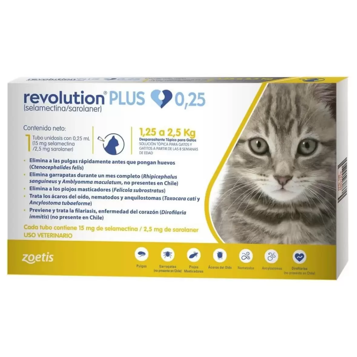 Revolution Plus 0,25 es un antiparasitario de uso tópico (se aplica sobre la piel), diseñado para brindar una protección completa a gatos y gatitos pequeños con un peso entre 1,25 kg y 2,5 kg (a partir de las 8 semanas de edad).