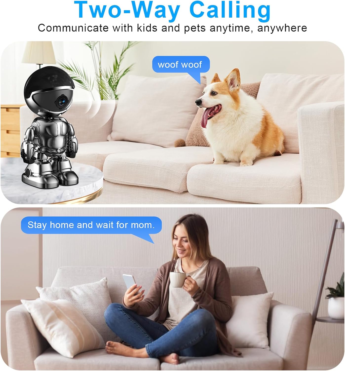 Audio de 2 vías: la cámara de seguridad para interiores tiene un micrófono y altavoz integrados, que admiten la comunicación bidireccional con miembros de la familia o visitantes sin ningún obstáculo.