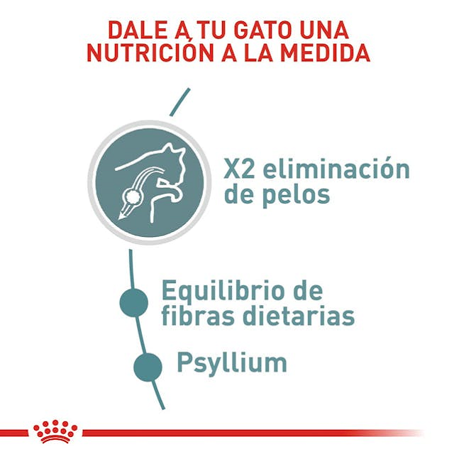 Royal Canin® Feline Care Nutrition Hairball Alimento Seco para Gato Adulto Control Bolas de Pelo Receta Pollo, 2.7 kg. Hairball de Royal Canin es para gatos a partir de 1 año de edad, con mayor predisposición a la formación de bolas de pelo (ej. gatos de pelo largo). Una combinación de diferentes tipos de fibras que estimula el tránsito intestinal y ayuda a facilitar la eliminación del pelo que su gato traga todos los días.