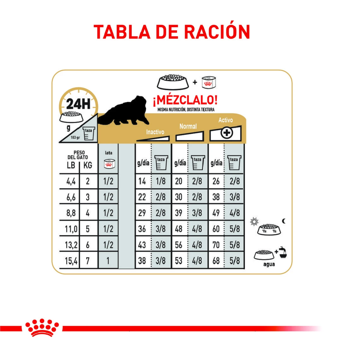 Para adaptarse a las preferencias individuales de cada gato, Royal Canin® Persian Adult también está disponible en formato húmedo en forma de paté suave y sabroso. Si deseas proporcionar a tu gato una alimentación mixta, sigue nuestras pautas de alimentación para garantizar que recibe la cantidad precisa de ambos alimentos y así aprovechar todos sus beneficios.