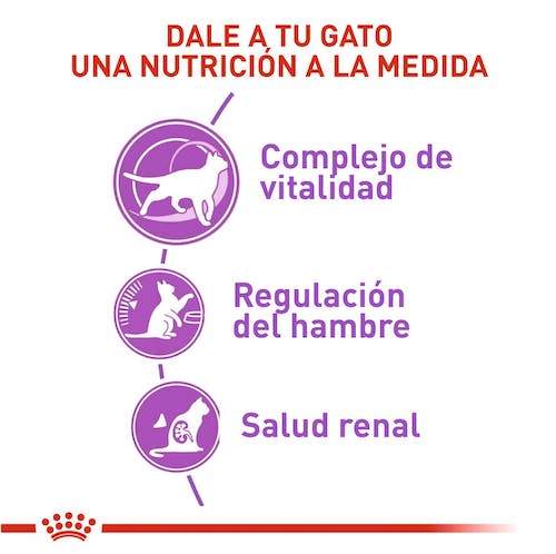Royal Canin® Sterilised 7+ es un alimento adecuado para gatos de más de 7 años, especialmente formulado teniendo en cuenta todas las necesidades de tu gato adulto.