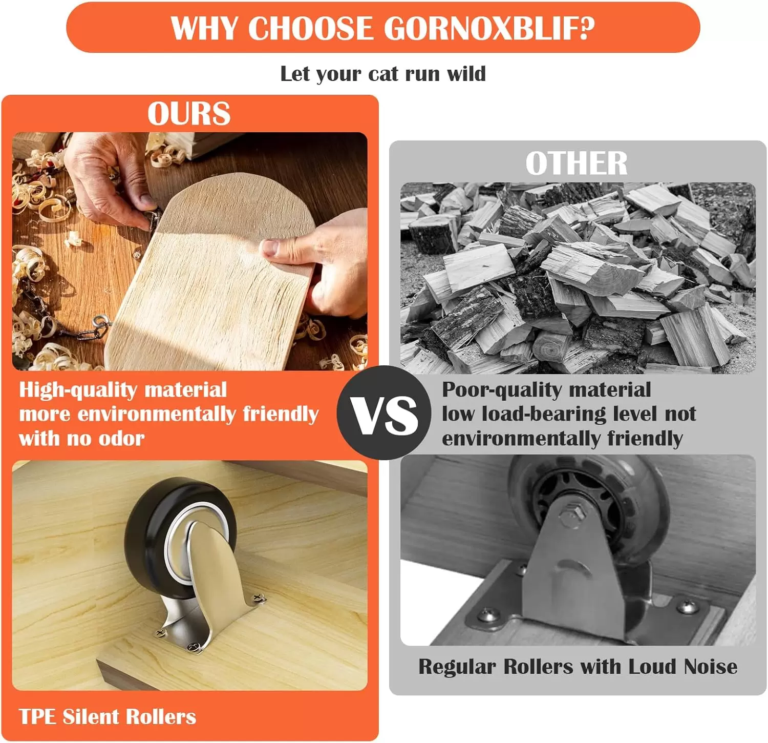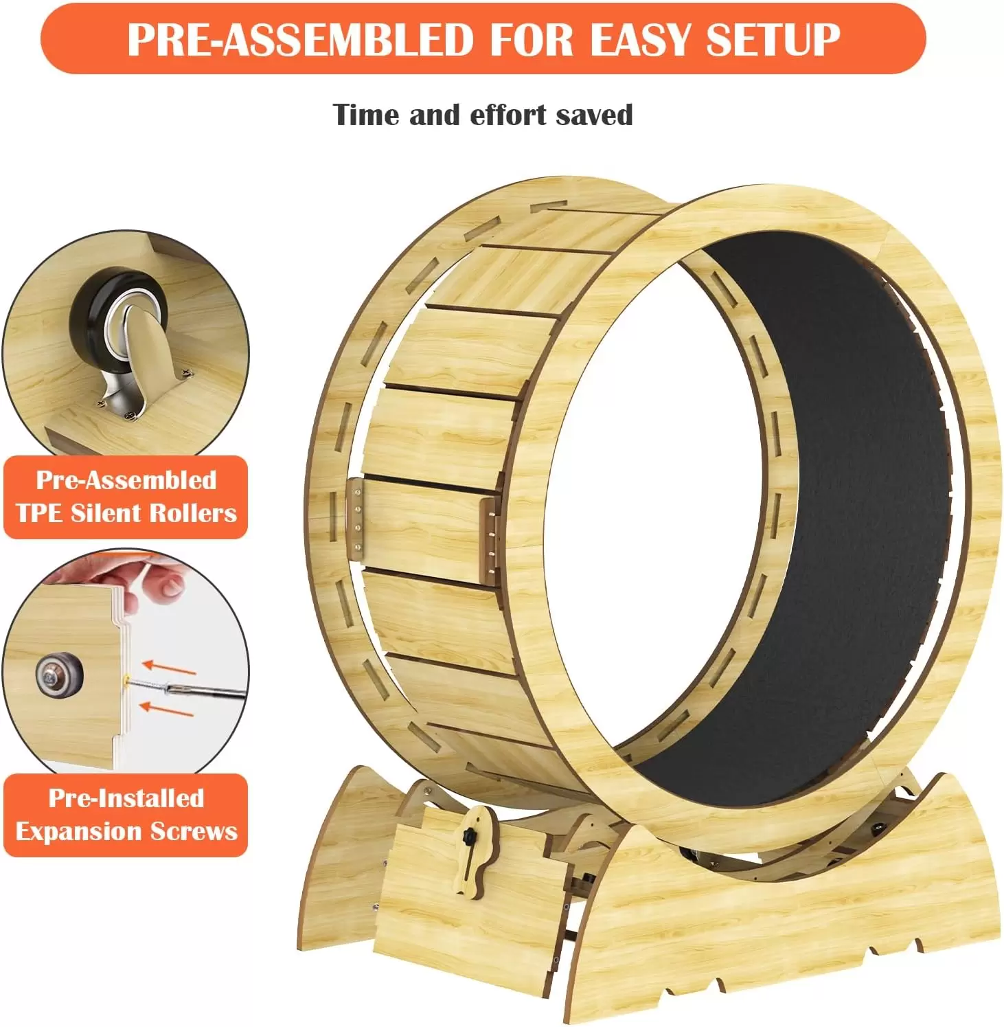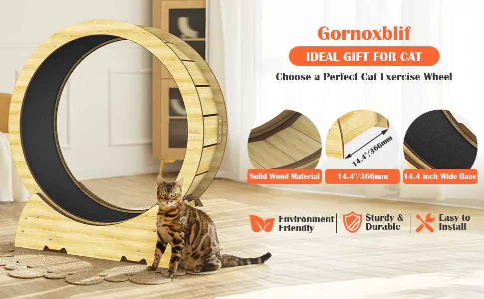 Material bien hecho y resistente: esta rueda para correr para gatos está hecha de madera maciza y es muy resistente. La rueda para gatos tiene una capacidad máxima de peso de 110 libras, no hay necesidad de preocuparse por el peso del gato en absoluto. Esta base de rueda de caminadora se ensancha para envolver completamente la rueda de carrera, muy estable sin preocuparse por volcarse.