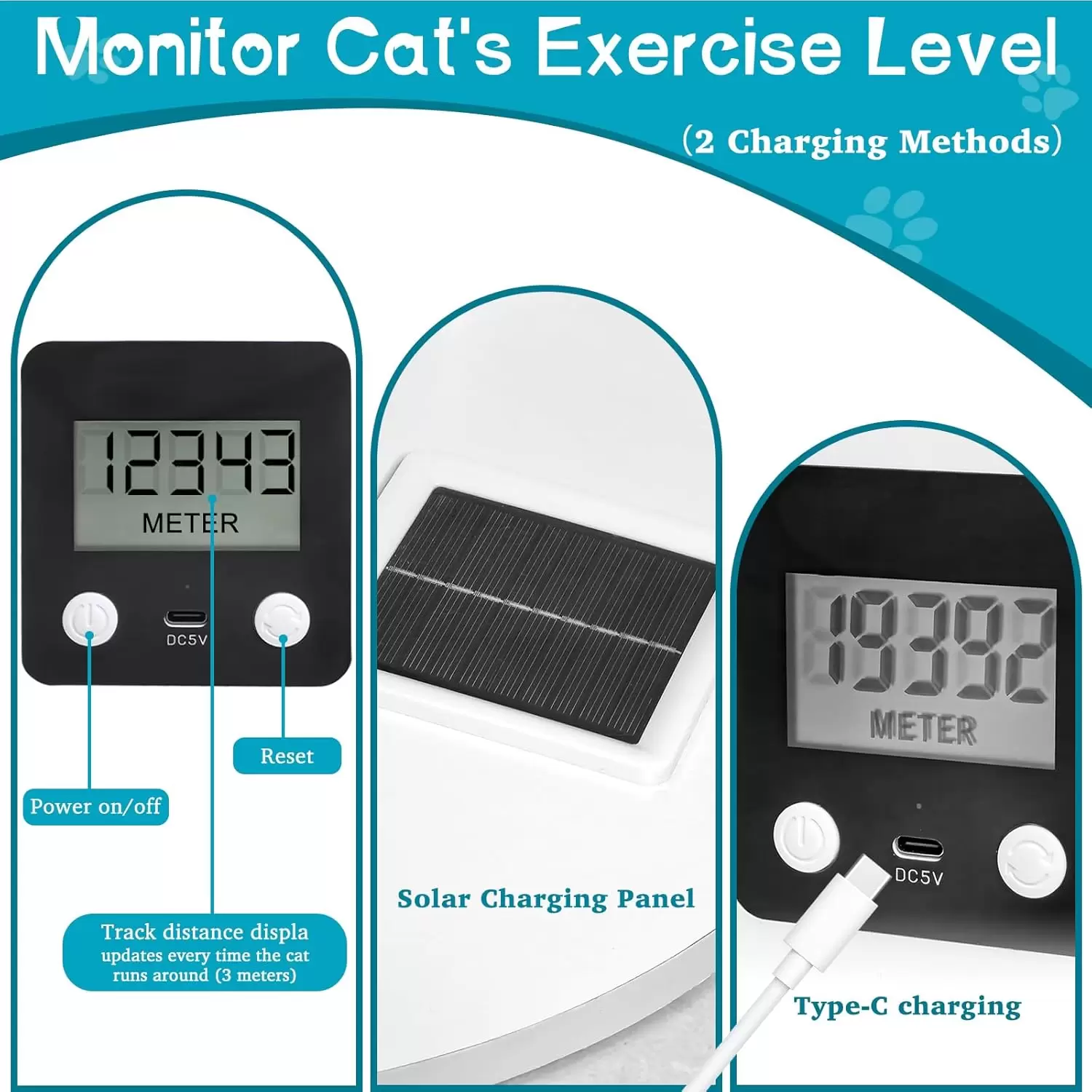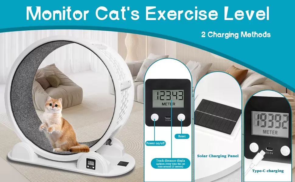 Más saludable: nuestra rueda de ejercicio silenciosa para gatos viene con un podómetro preciso y se puede cargar a través de un adaptador tipo C y un panel solar integrado. Los datos registrados le permiten comprender con mayor precisión el ejercicio de su gato. Proporciona una gran manera para que nuestros gatos hagan ejercicio, reduce su riesgo de sobrepeso y hace que los gatos queridos sean más activos y saludables