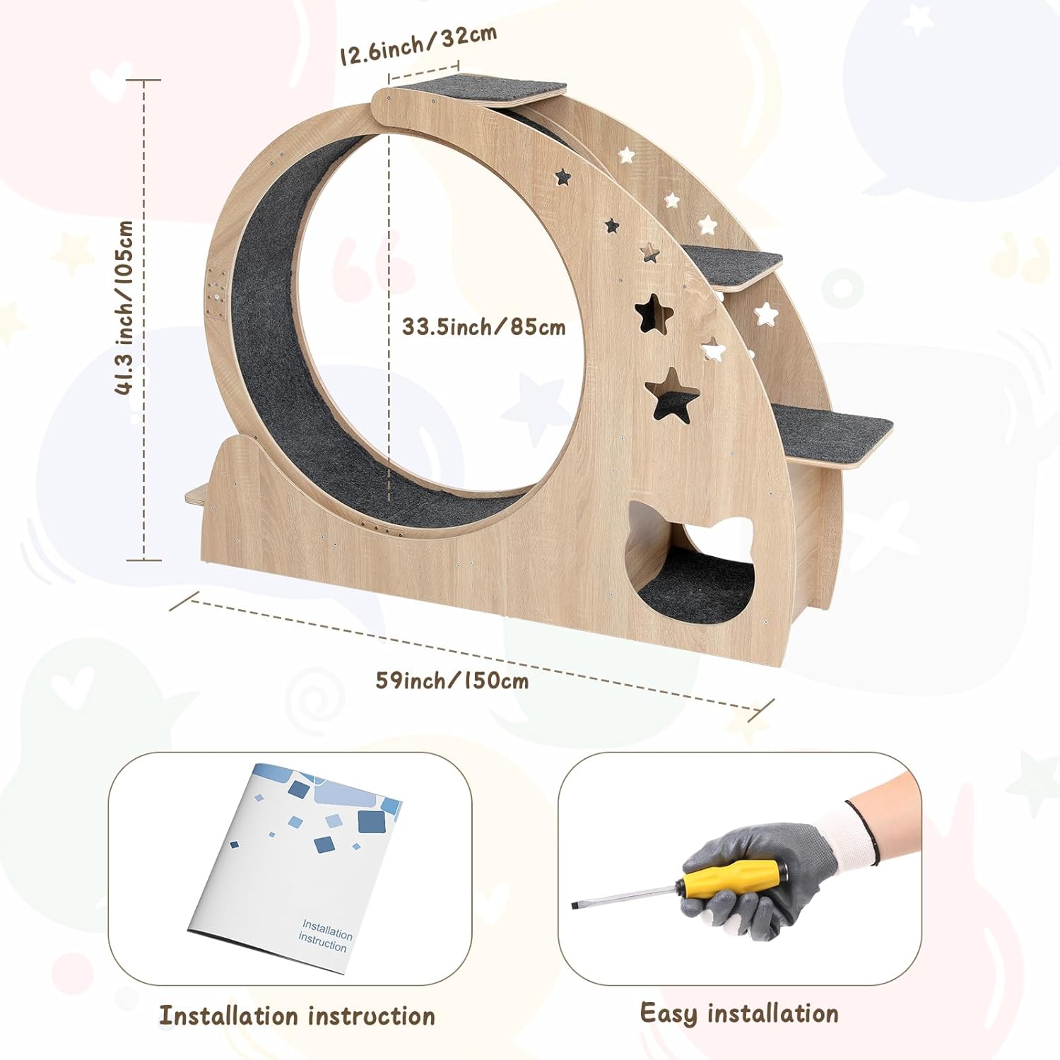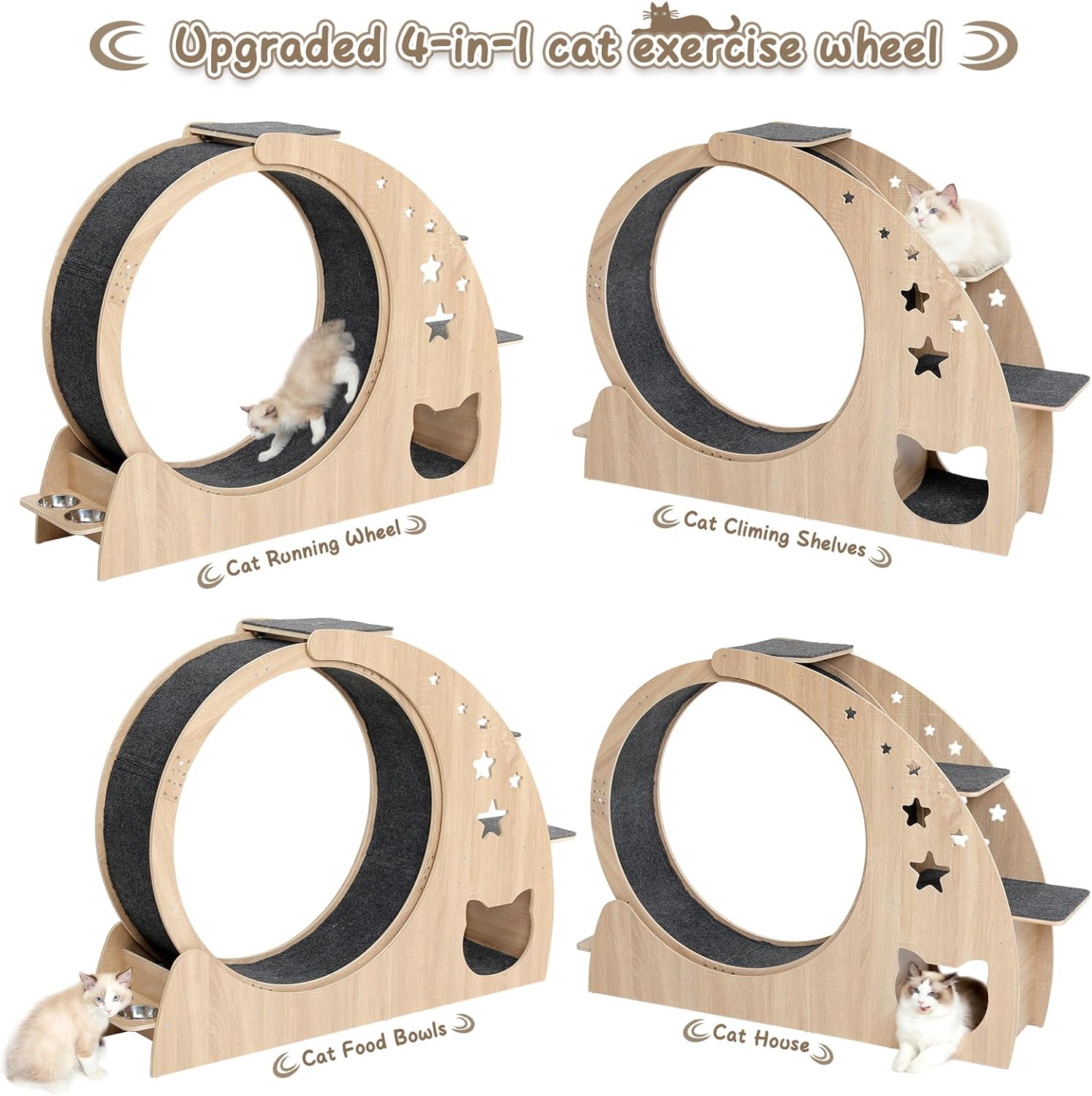 Rueda para gatos mejorada de 5-1 pulgadas, rueda para gatos mejorada, ruedas mejoradas para gatos de interior, no solo una rueda de ejercicio para gatos, sino también un parque infantil para gatos. Cuando termina de correr, hay 3 pasos de salto que pueden atraer la atención del gato y satisfacer la naturaleza de escalada del gato. El apartamento para gatos en la parte inferior derecha de la rueda para gatos se convertirá en el refugio favorito del gato. El cuenco de alimentación en el lado inferior izquierdo puede ser disfrutado por el gato en cualquier momento. La rueda para gatos es la elección de más dueños de gatos.