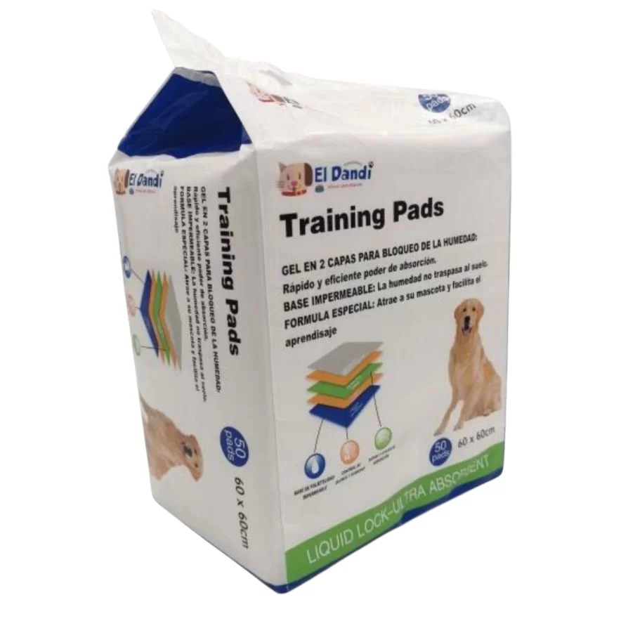 Sabanillas El Dandi con atrayente y doble capa de gel que encapsula la orina y el olor. Su base impermeable es ideal para entrenar cachorros protegiendo tus pisos.