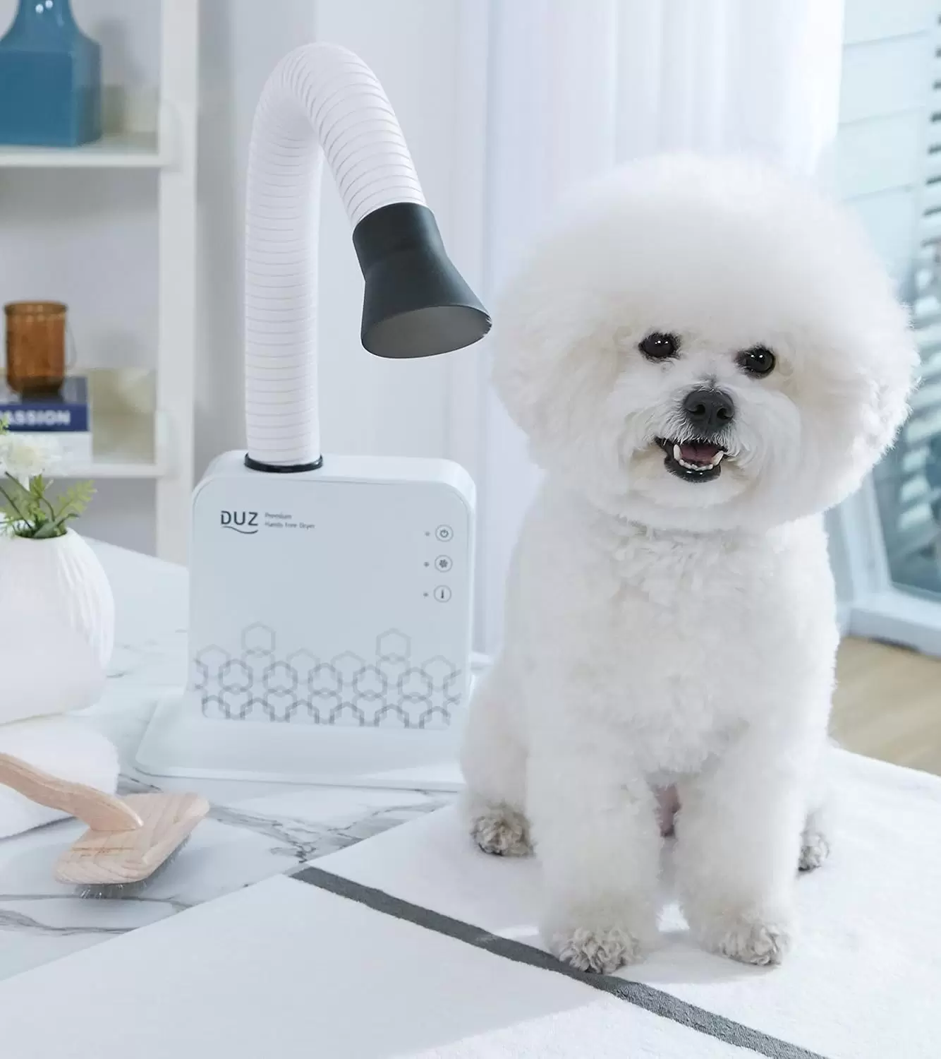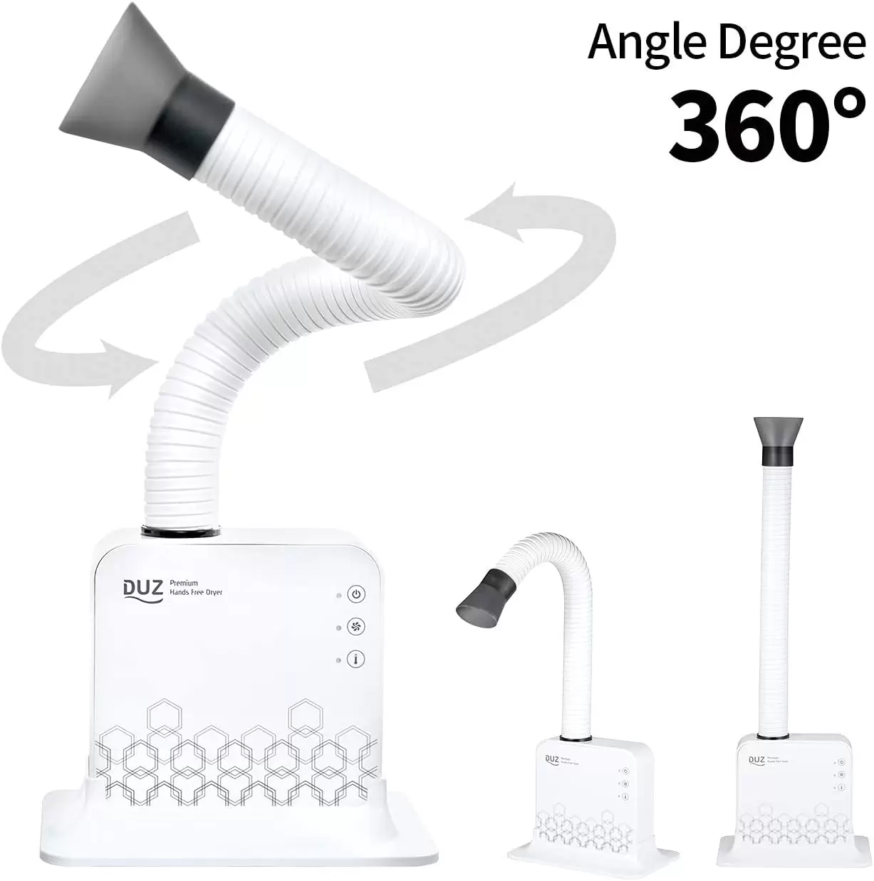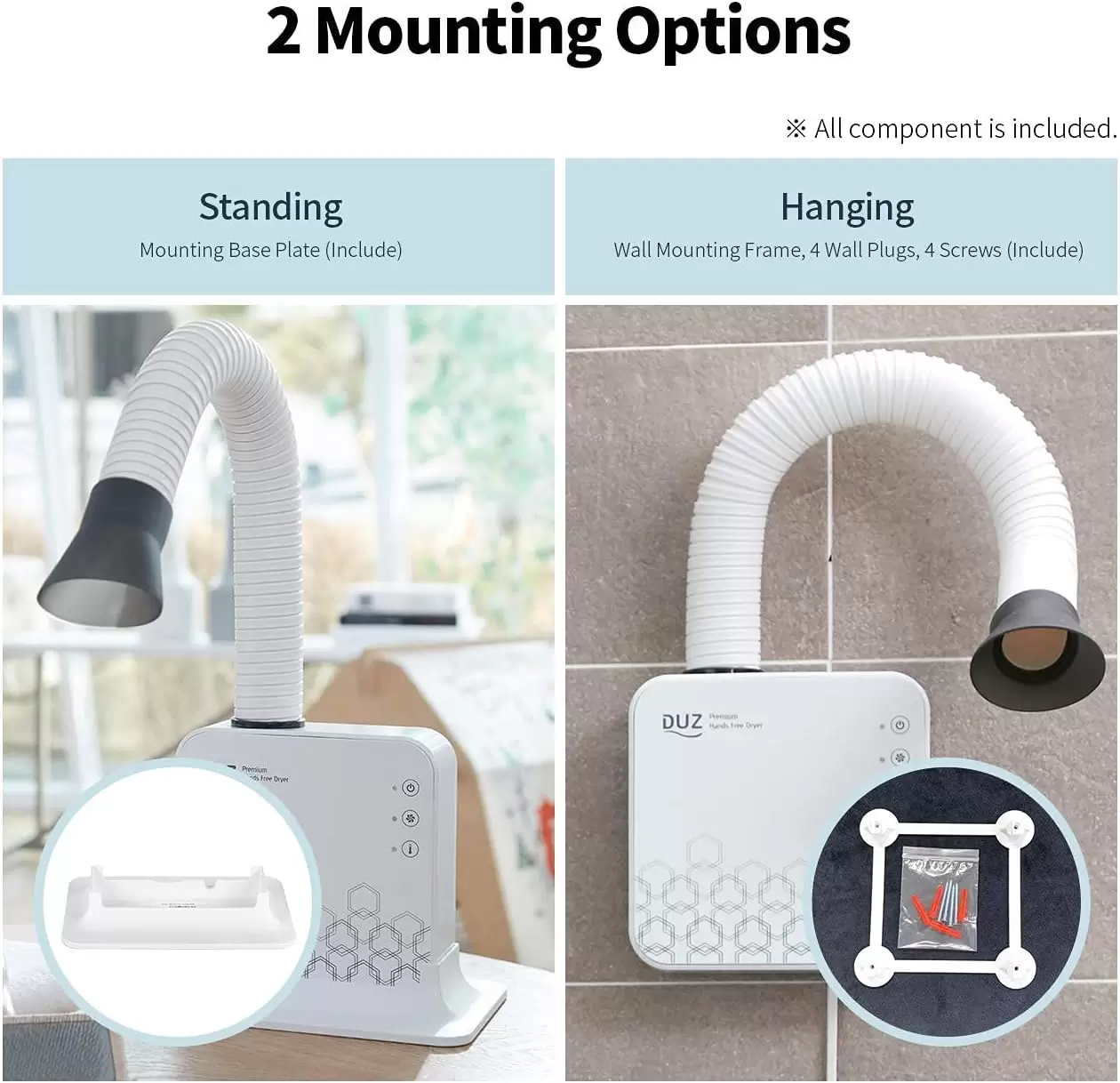 Cómoda y ligera secadora para mascotas con un tubo de secado ajustable de 360 grados, diseñado para llegar sin esfuerzo a todas las áreas del pelaje de tu mascota. Viene con una base de pie y un accesorio de montaje en pared para diversas opciones de uso.