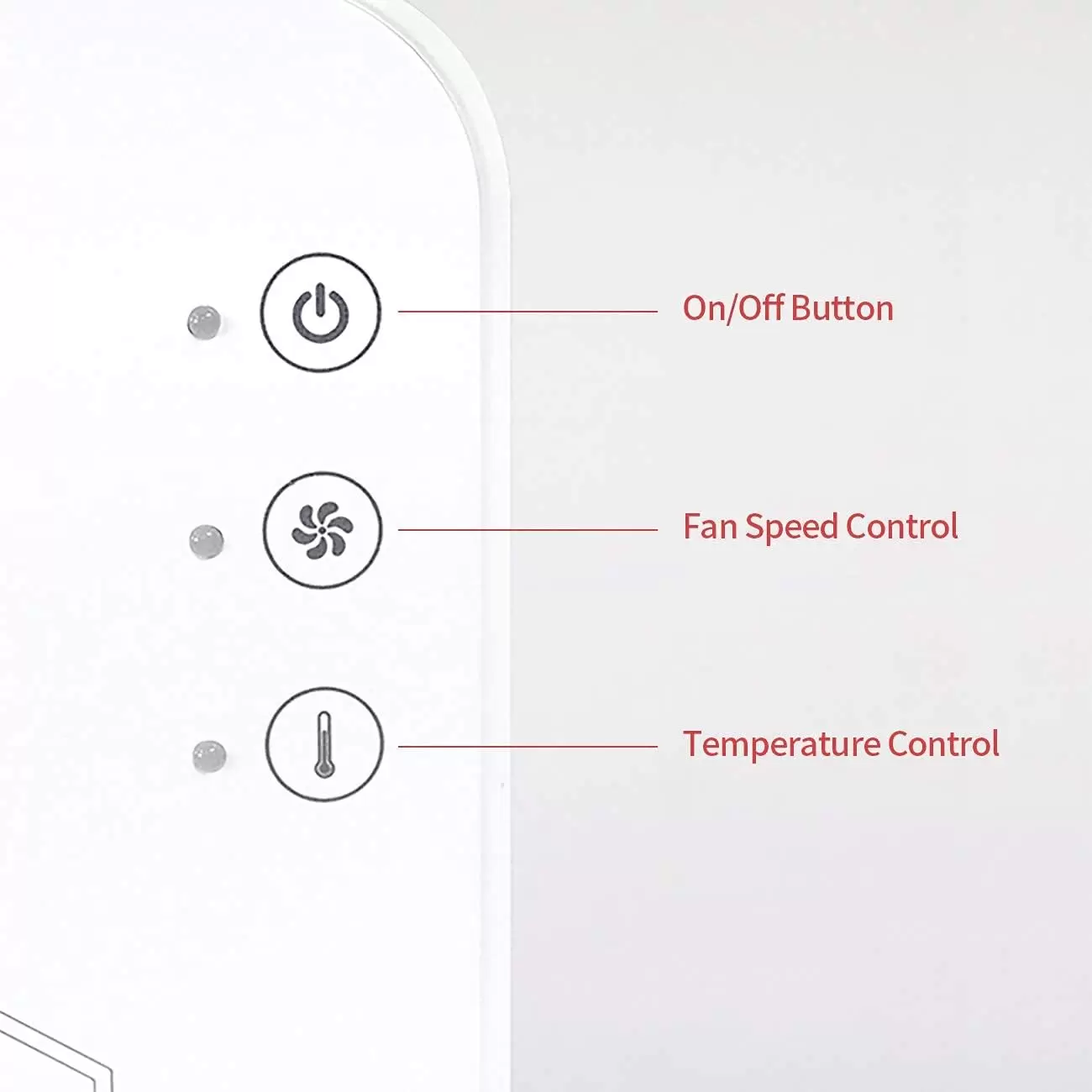 Los botones táctiles intuitivos permiten un fácil control de encendido/apagado, velocidad del ventilador (máximo 37 CFM) y ajustes de calor ajustables (sin calor, bajo (113 °F), medio (140 °F), alto (170 °F), proporcionando un control preciso sobre el proceso de aseo.