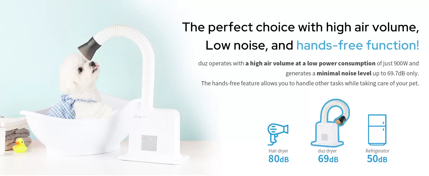 Seca el pelaje de tu mascota en la mitad de tiempo. El secador de alta potencia es ultra silencioso, haciendo el aseo más fácil y agradable para todos en casa.
