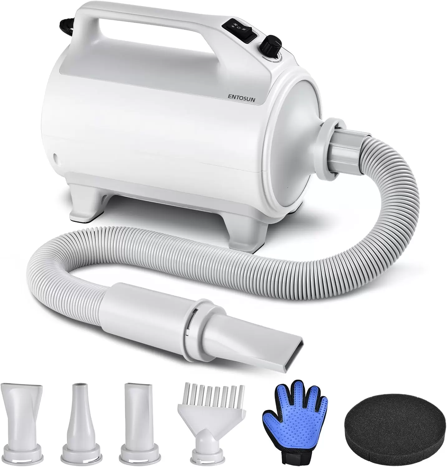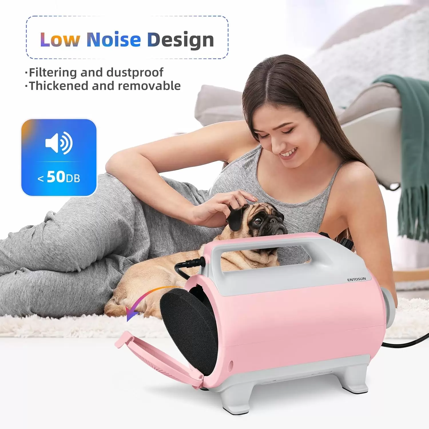 Secador profesional para perros equipado con un motor potente y estable. Potencia de salida 4.3hp. En comparación con los secadores de pelo de mano, el secador de pelo para perros reduce el tiempo más del 60%. Este secador de pelo para mascotas funciona con un sonido relativamente silencioso de menos de 50 db, que puede proporcionar el máximo cuidado para el cabello de tu mascota cuando se seca.