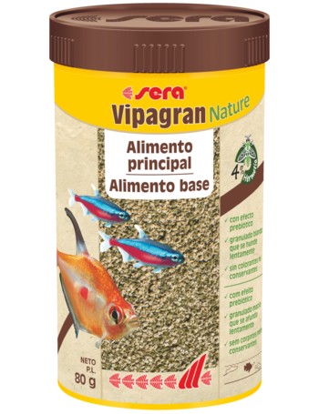 sera Vipagran Nature es el alimento principal en forma de granulado blando elaborado conservando todas sus propiedades, sin colorantes ni conservantes, para todos los peces que comen en las zonas intermedias del agua.