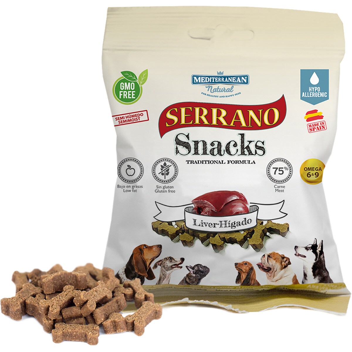 - Los Serrano Snacks de Mediterranean Natural, delicadamente cortados en pequeñas cantidades, garantizan la seguridad de la mascota, mantienen su pureza y todos los nutrientes, reflejan la dieta natural y contienen un 70 % de carne fresca (60% en »Serrano Snacks for Puppies»). Elaborados con materias primas exentas de gluten y colorantes.