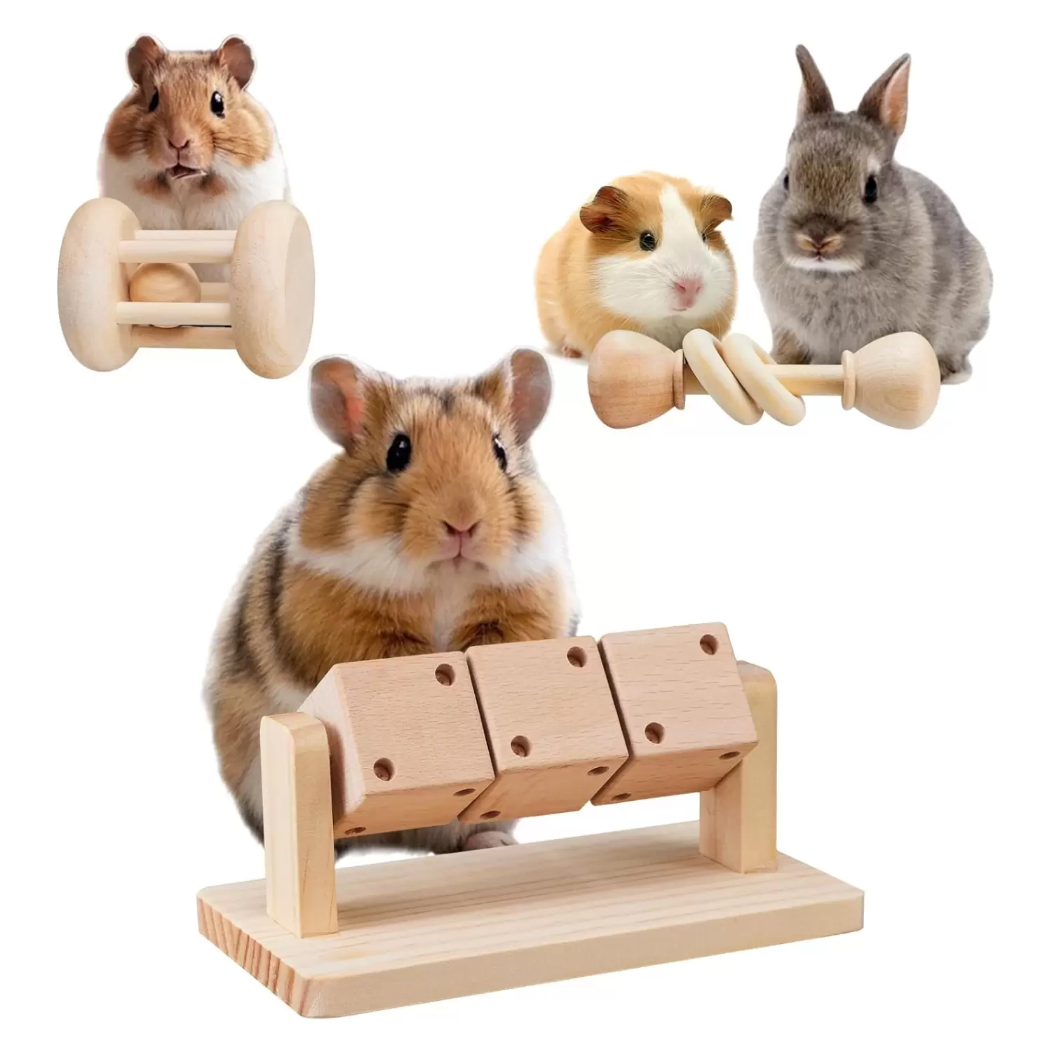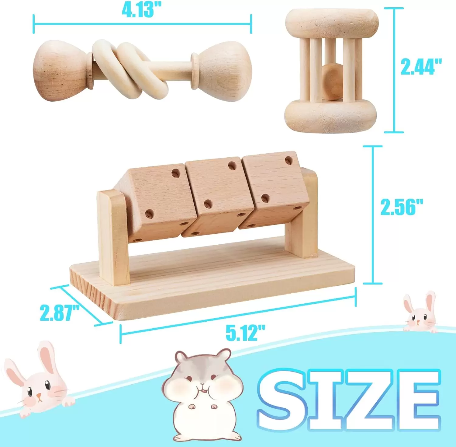 3 Juguetes Dispensadores de madera natural y no tóxica. Mantienen al hámster ocupado y activo. Ideal para moler los dientes y reducir el aburrimiento y la ansiedad.