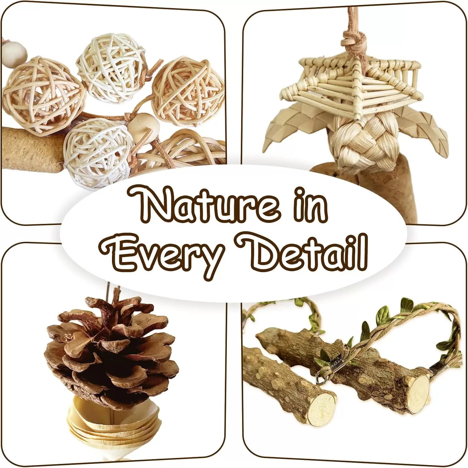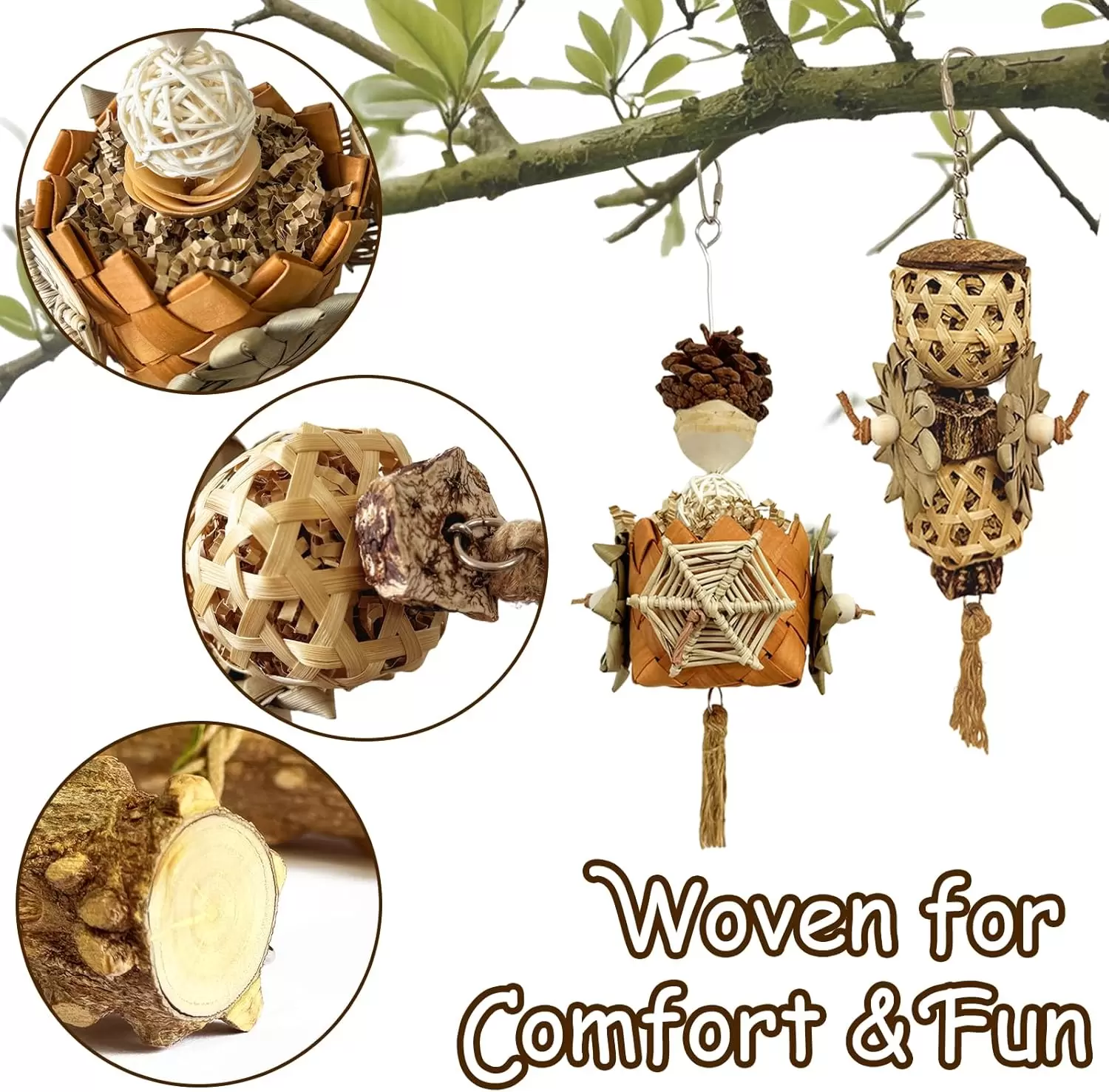 Materiales naturales y seguros: hecho de materiales no tóxicos, naturales como tejido de bambú, madera de pimienta de flores, bolas de ratán, cáscaras de maíz y cuentas de madera, proporcionando una experiencia segura y enriquecedora para tus amigos emplumados. Perfecto para juguetes de loros, juguetes de cacatúa y juguetes de conure.