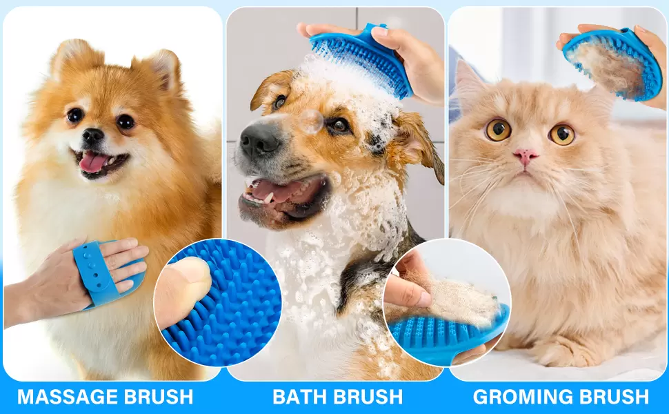 Juego de cepillos de baño perfecto para mascotas: este juego de cepillos de ducha para perros contiene 3 cepillos con diferentes funciones, que pueden resolver eficazmente los problemas de baño, depilación, masajes y aseo de tu mascota. Deja que tu mascota se enamore del baño y disfrute de la hora del baño. ¡El mejor regalo de baño para mascotas!