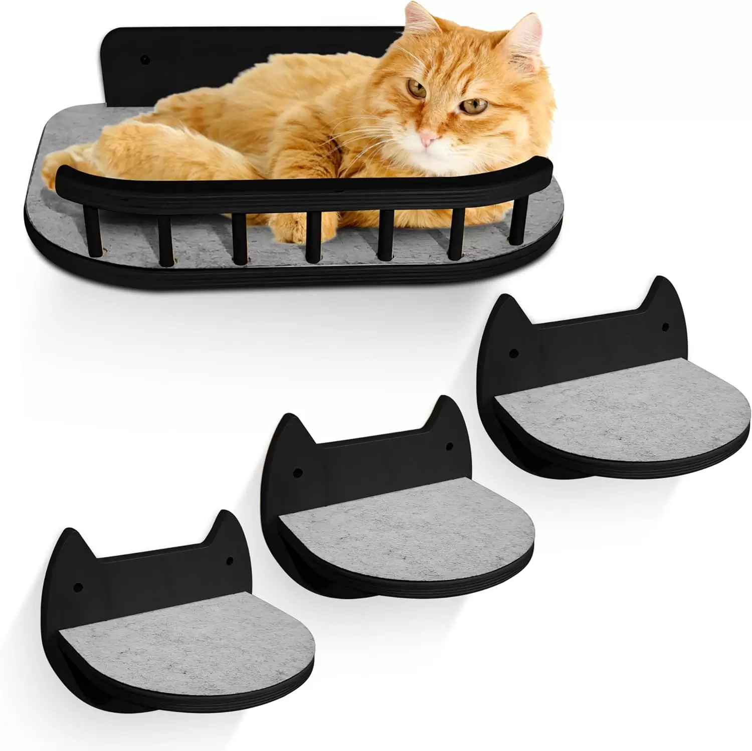 Set mural de madera negra para gatos (25x20x15 cm). Incluye cama y 3 escalones. Soporta 30 kilos. Diseño moderno que ahorra espacio y decora.