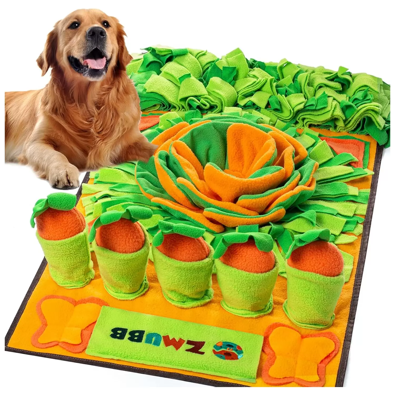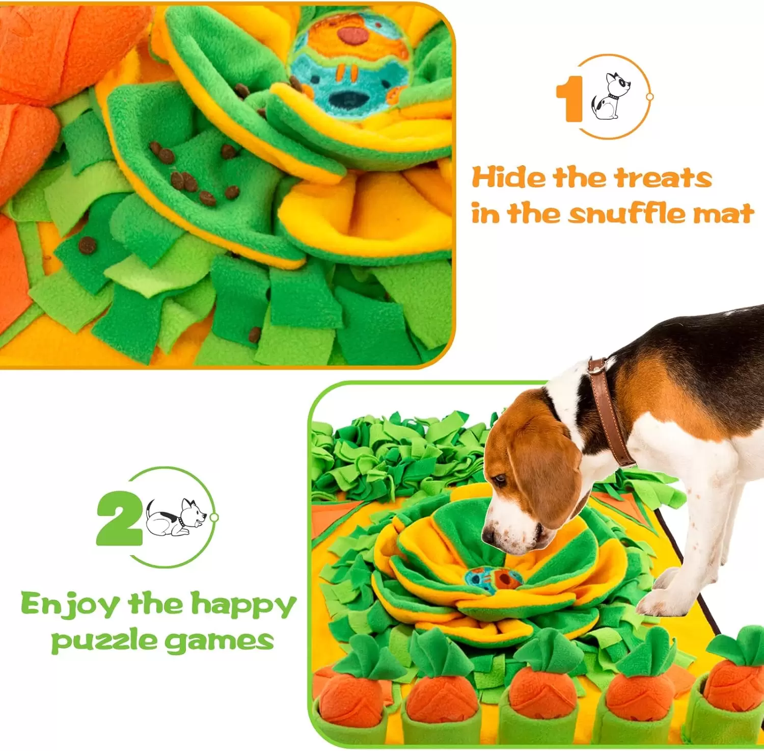 Seguro y divertido: el tapete para olfatear perro está hecho de poliéster de alta calidad y construcción duradera que es segura para ti y tus mascotas. Puedes ocultar golosinas en las ricas formas de hierba para animar a tu perro a buscar alimento de forma natural. Un chirriante en el centro del pétalo, cinco zanahorias seguidas y varios trozos de papel de timbre colocados al azar despiertan el interés de su perro y les dan mucha diversión.