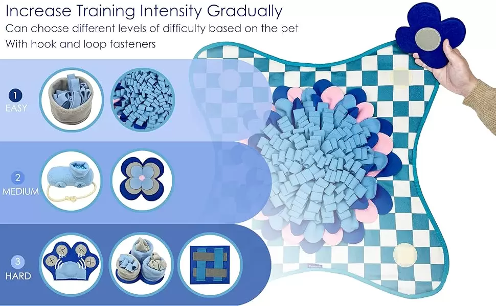 Fácil de almacenar: el diseño con una banda elástica permite que se pliegue en una bolsa portátil, adecuado para perros medianos y pequeños. El exclusivo velcro te permite combinar fácilmente juguetes en una alfombrilla para olfatear mascotas.