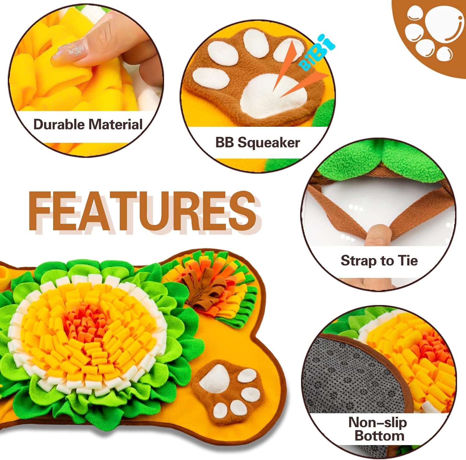 Juego de alimentación rico: esta alfombrilla de olfateo es adecuada para todos los perros. La bonita pata tiene un sonido integrado, que puede atraer la atención del perro y estimular el interés del perro. Las “flores” densas y de varias capas son el lugar perfecto para ocultar la comida, y los perros necesitan tiempo para olfatear para encontrar sus golosinas favoritas. Los cinco cuencos pequeños están especialmente diseñados teniendo en cuenta las necesidades de olfateo de los perros de nariz larga.