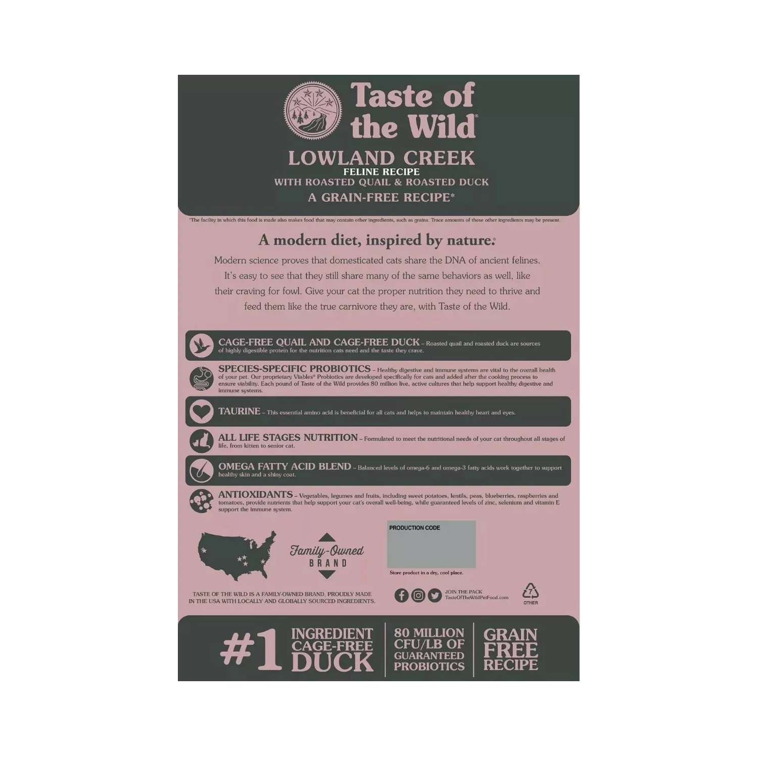 Taste of The Wild Lowland Creek Feline es una fórmula sin cereales para todas las etapas de la vida que proporciona energía altamente digerible para tu gato activo. Hecho con carne de pato y codorniz asada, ofrece una sensación de sabor sin igual. Para un gato sano de hoy, esta fórmula se complementa con frutas y vegetales, proporcionando antioxidantes naturales para apoyar un sistema inmune saludable y una buena salud general.