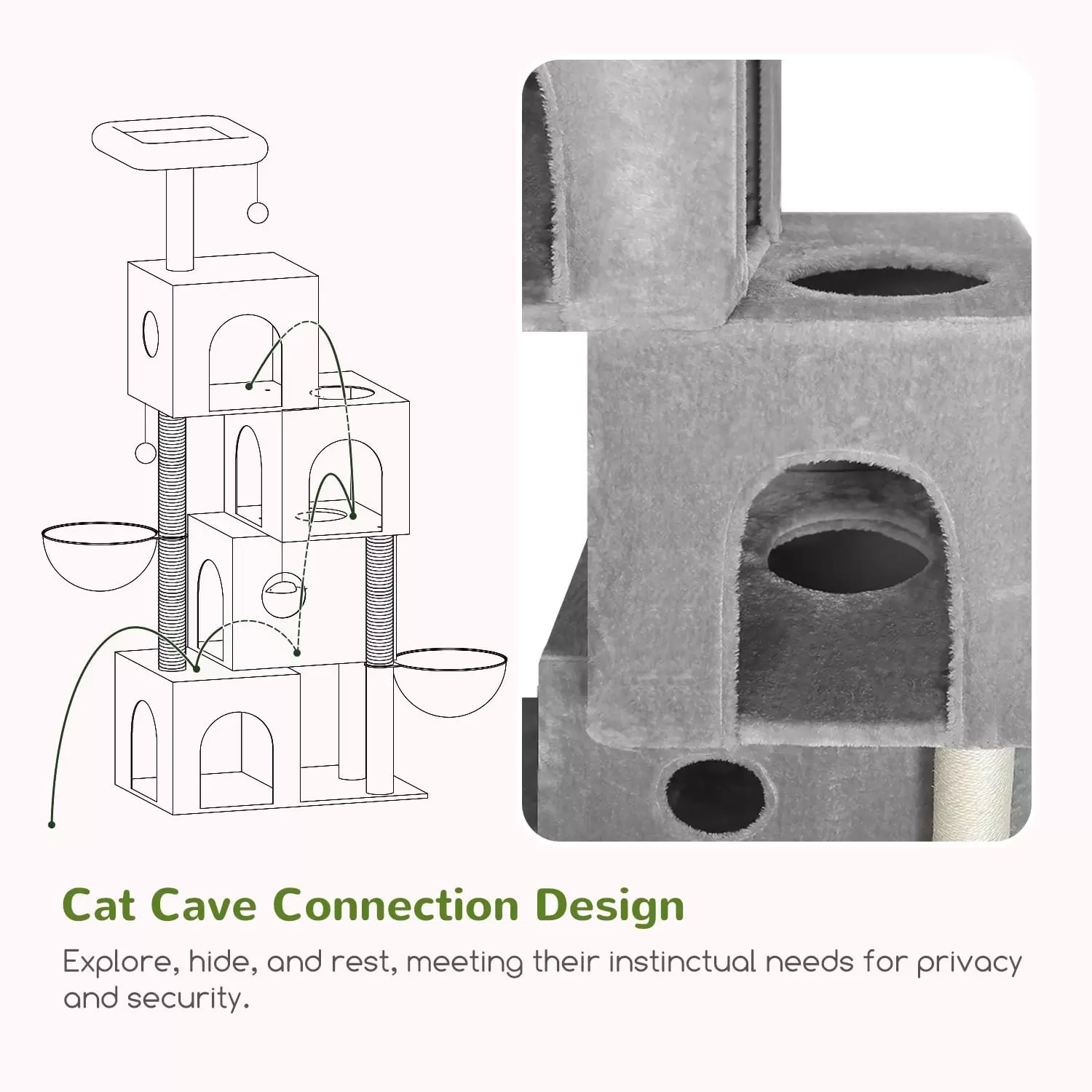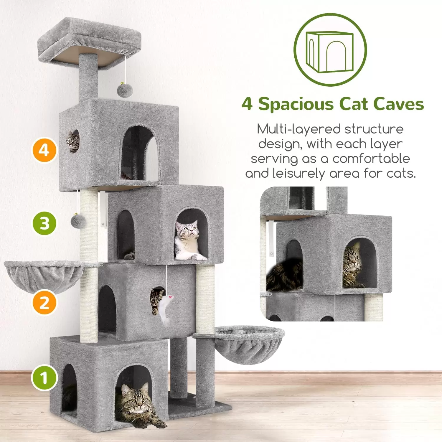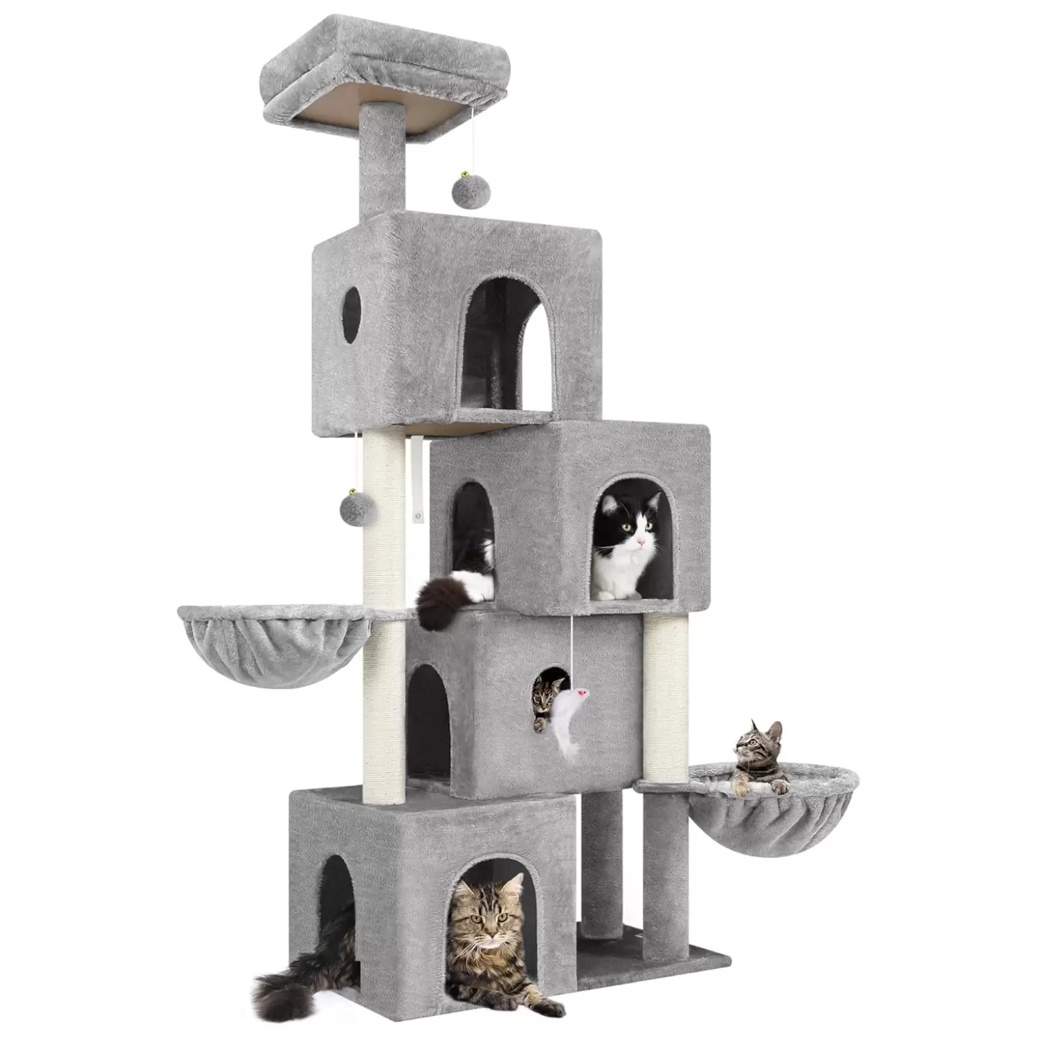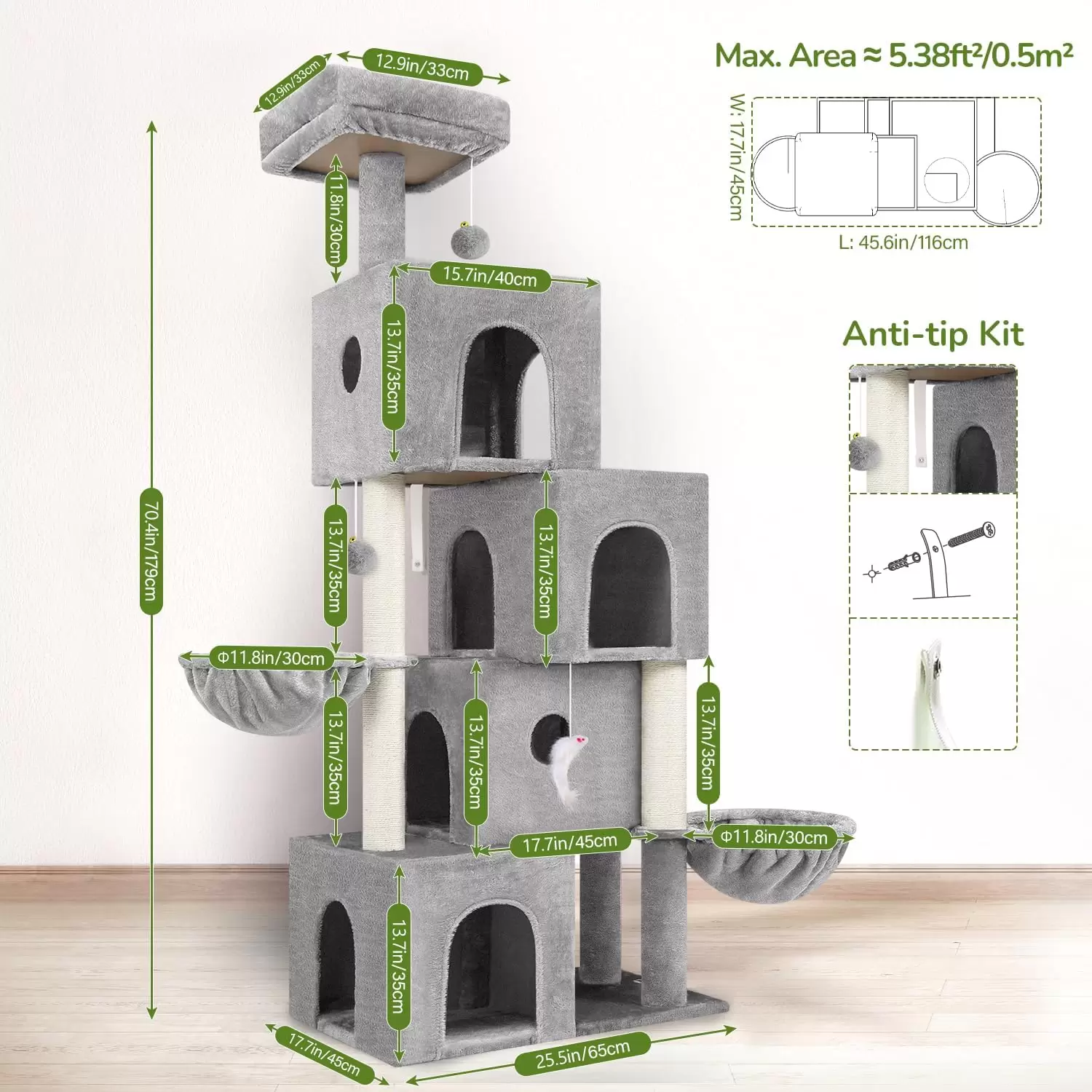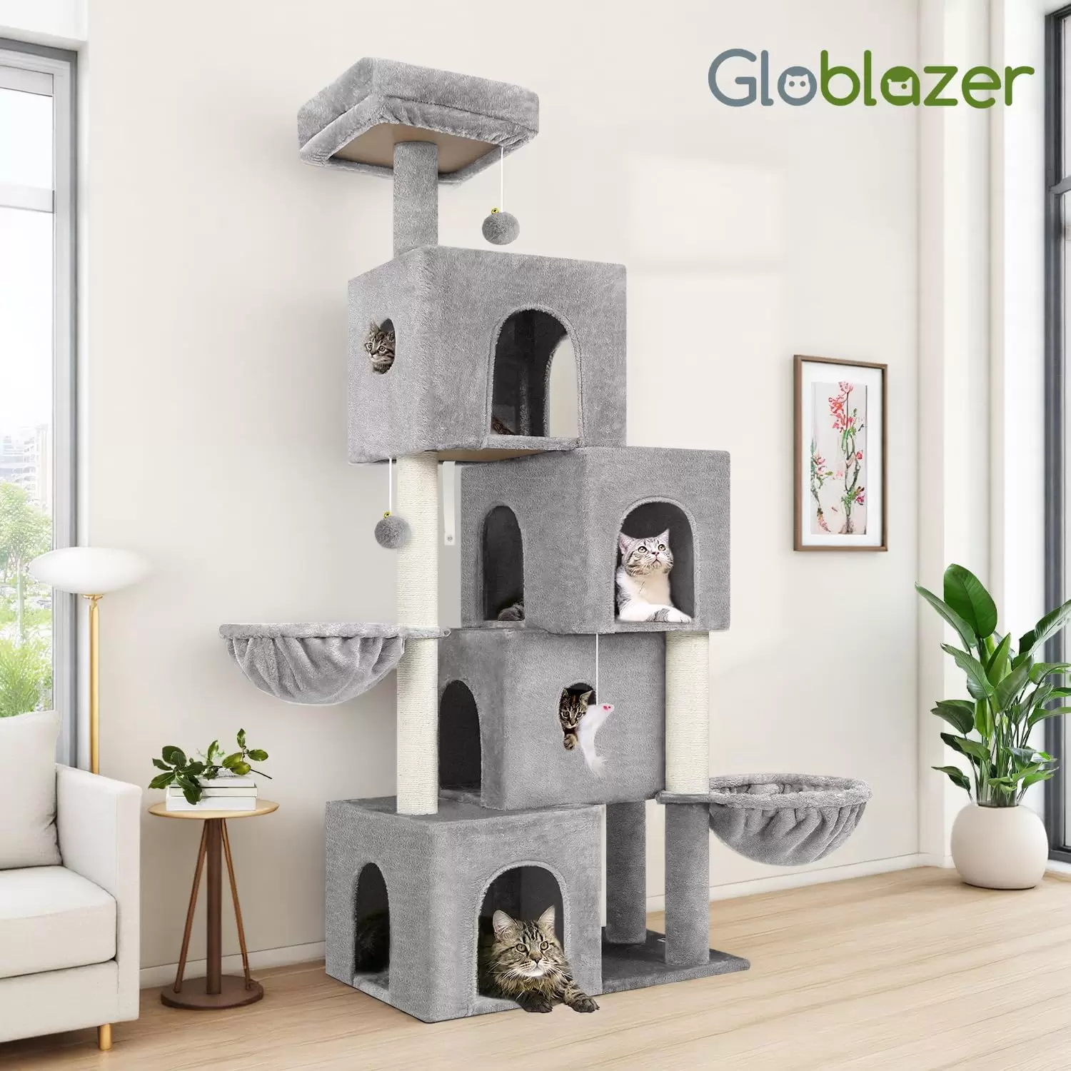 Torre de diseño moderno de 179 centimetros. Cuatro condominios conectados por tuneles internos. Estructura estable y decorativa para gatos grandes. Espacios amplios para descansar y explorar.