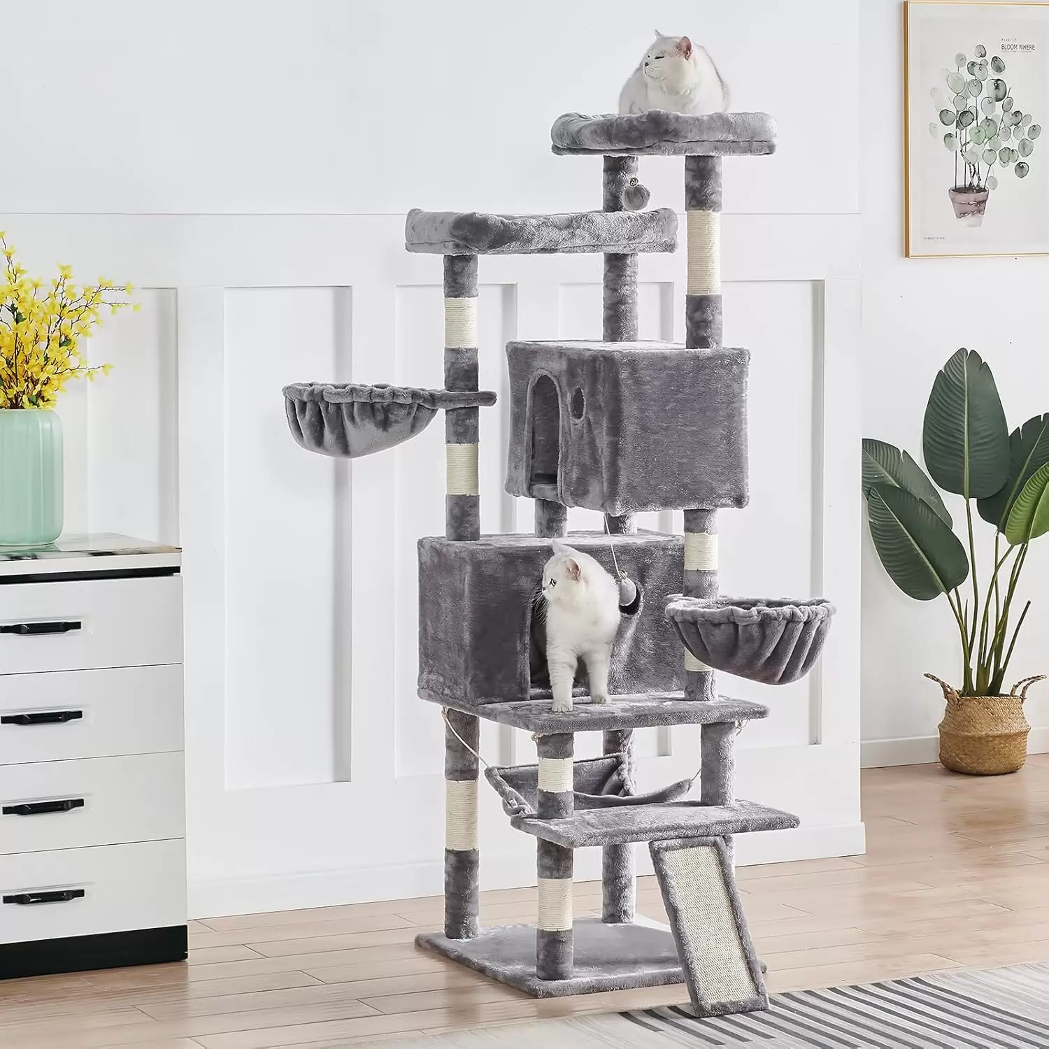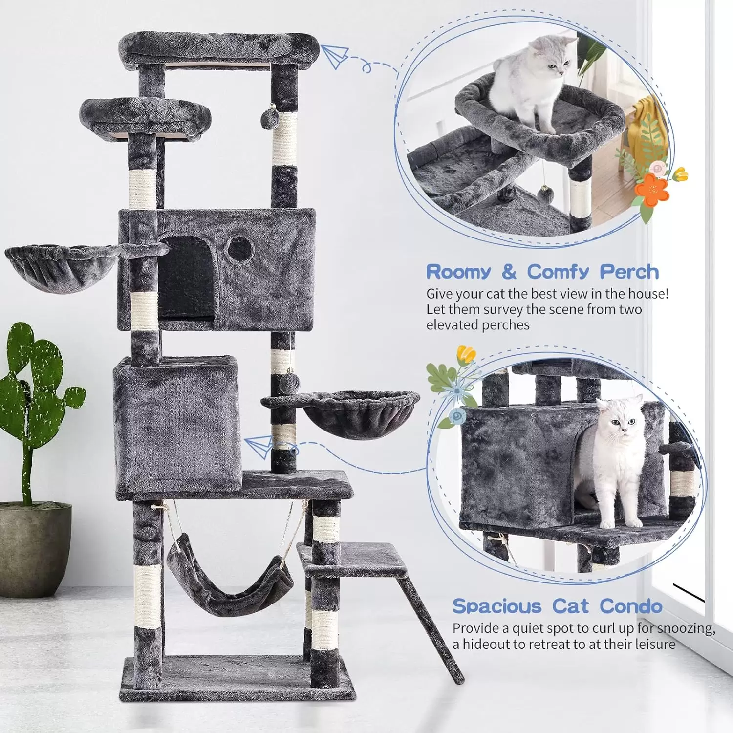 Espacios Sobredimensionados y Altura: Altura y Vision: Con 170 centimetros de alto, el arbol facilita que los gatos observen su “reino”. Es ideal para gatitos y gatos grandes. Perchas Amplias: Dos perchas grandes de felpa (50 por 25 centimetros) estan acolchadas para que su mascota se acueste y descanse sin obstaculos.